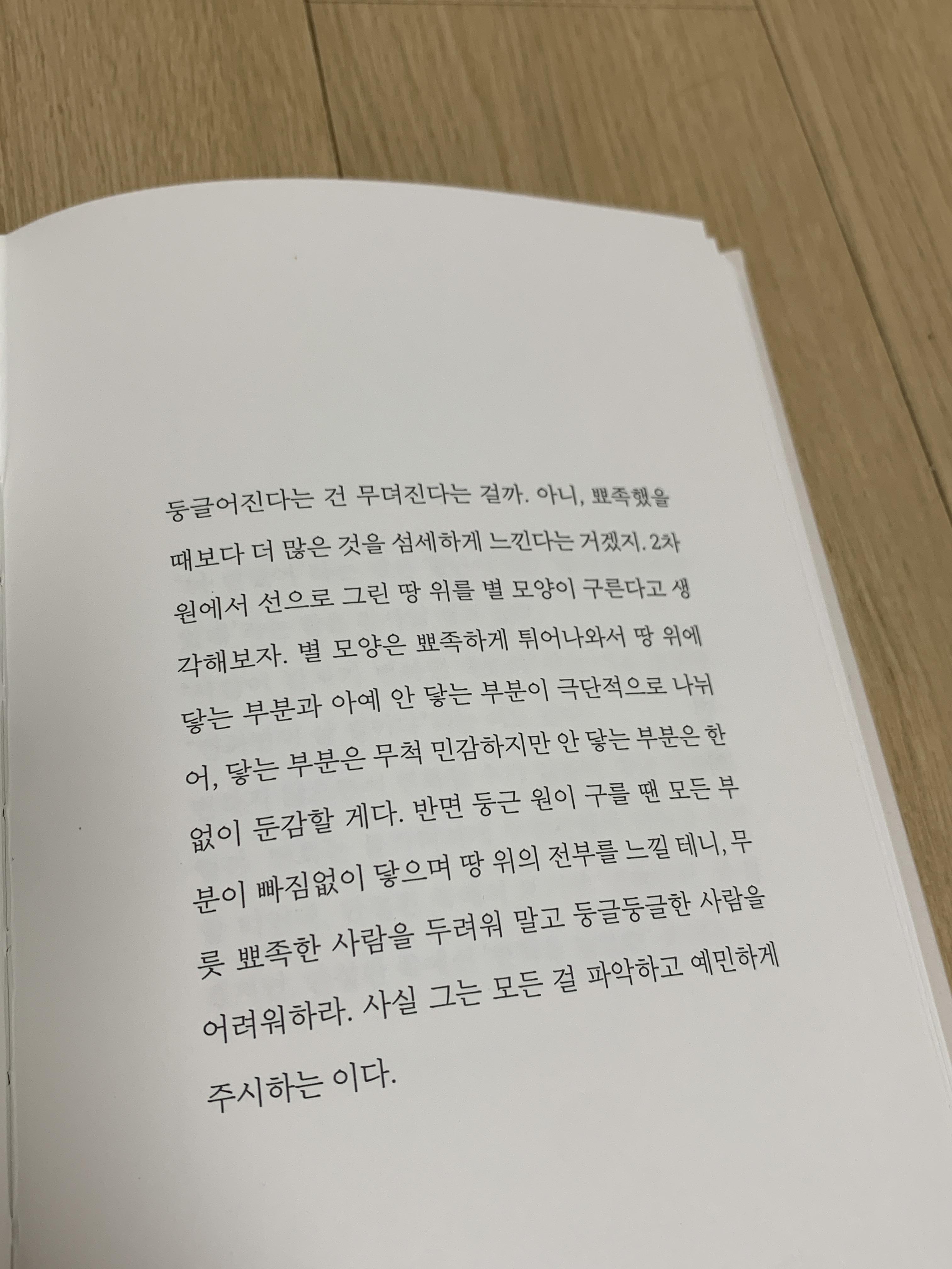 둥글어진다는 건 무뎌진다는 걸까. 아니, 뾰족했을 때보다 더 많은 것을 섬세하게 느낀다는 거겠지. 2차 원에서 선으로 그린 땅 위를 별 모양이 구른다고 생각해보자. 별 모양은 뽀족하게 튀어나와서 땅 위에 닿는 부분과 아예 안 닿는 부분이 극단적으로 나뉘어, 닿는 부분은 무척 민감하지만 안 닿는 부분은 한 없이 둔감할 게다. 반면 둥근 원이 구를 땐 모든 부분이 빠짐없이 닿으며 땅 위의 전부를 느낄 테니, 무릇 뾰족한 사람을 두려워 말고 둥글둥글한 사람을 어려워하라. 사실 그는 모든 걸 파악하고 예민하게 주시하는 이다.