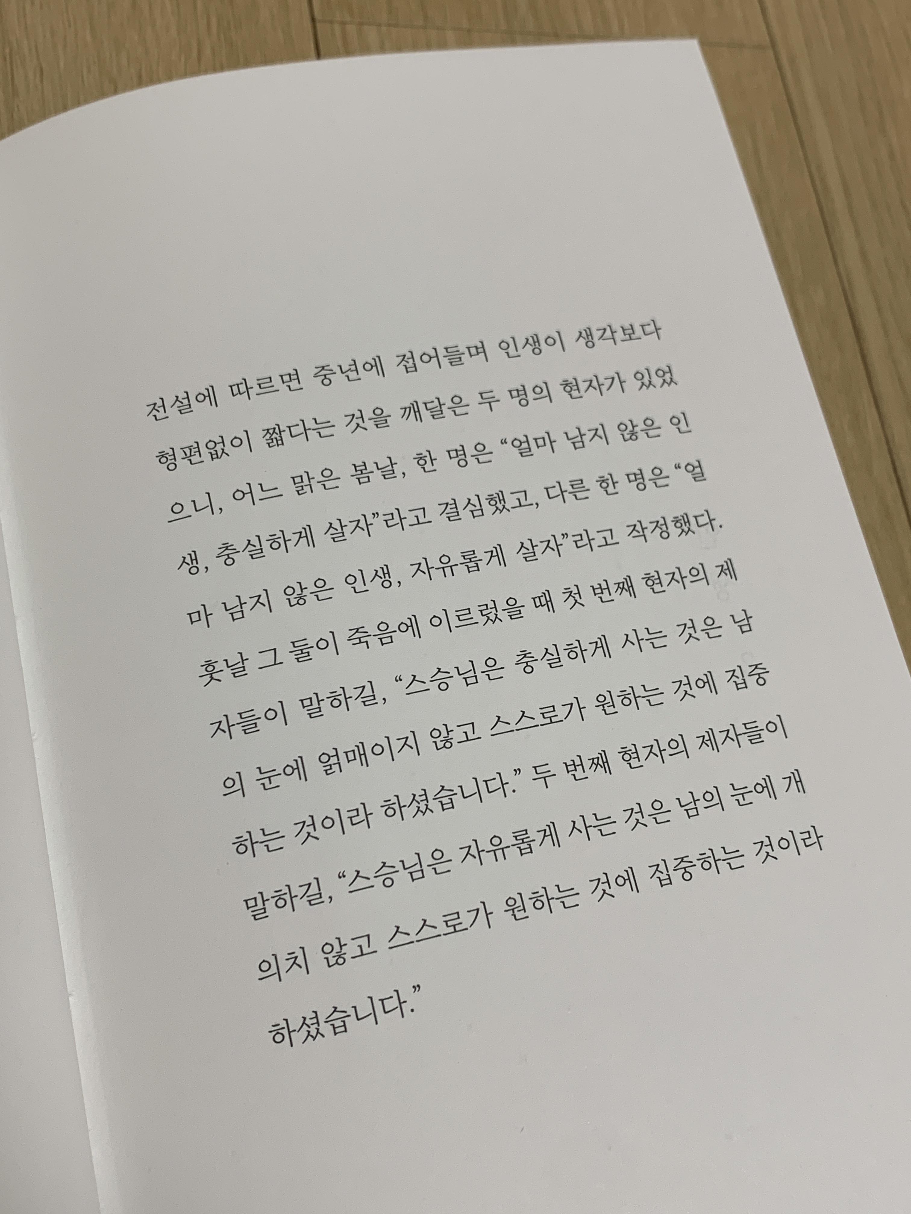 두 명의 현자들은 얼마남지 않은 인생을 각자 충실하게, 자유롭게 살자고 다르게 말하였다. 하지만 그 두 개의 의미는 다른 사람의 눈에 얽매이거나 개의치않고 원하는 것에 집중하라는 의미는 같았다. 내 인스타그램 소개 문구 ‘상현이와 걱정보다는 생각을, 남들의 시선보다는 재미를 택하며 살고 싶습니다.‘도 이와 같은데, 지향하는 가치관이 맞아 더 감명깊게 읽었다.