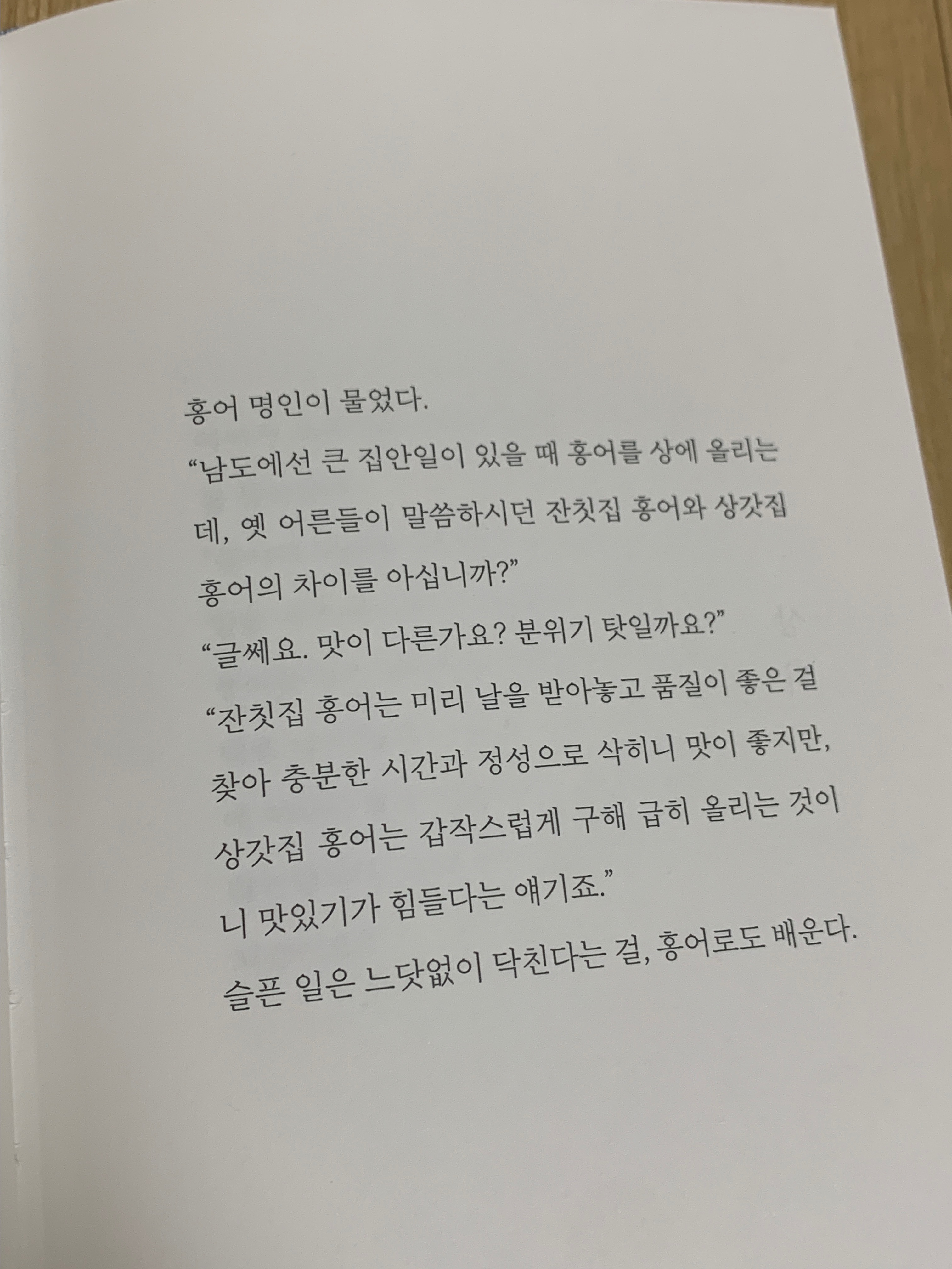 "남도에선 큰 집안일이 있을 때 홍어를 상에 올리는 데, 옛 어른들이 말씀하시던 잔칫집 홍어와 상갓집 홍어의 차이를 아십니까?” “글쎄요. 맛이 다른가요? 분위기 탓일까요?"