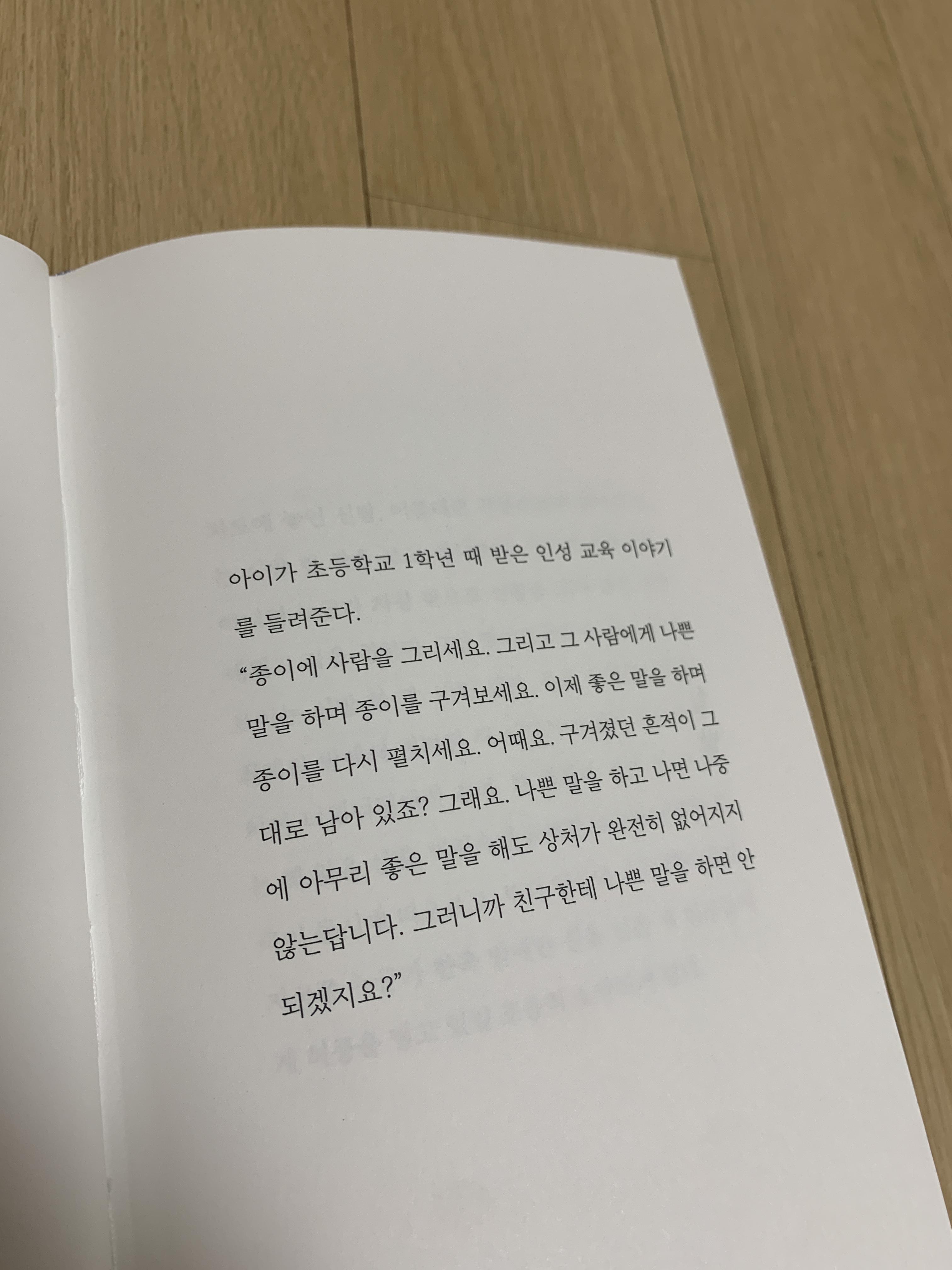 “종이에 사람을 그리세요. 그리고 그 사람에게 나쁜 말을 하며 종이를 구겨보세요. 이제 좋은 말을 하며 종이를 다시 펼치세요. 어때요. 구겨졌던 흔적이 그 대로 남아 있죠? 그래요. 나쁜 말을 하고 나면 나중에 아무리 좋은 말을 해도 상처가 완전히 없어지지 않는답니다. 그러니까 친구한테 나쁜 말을 하면 안 되겠지요?
