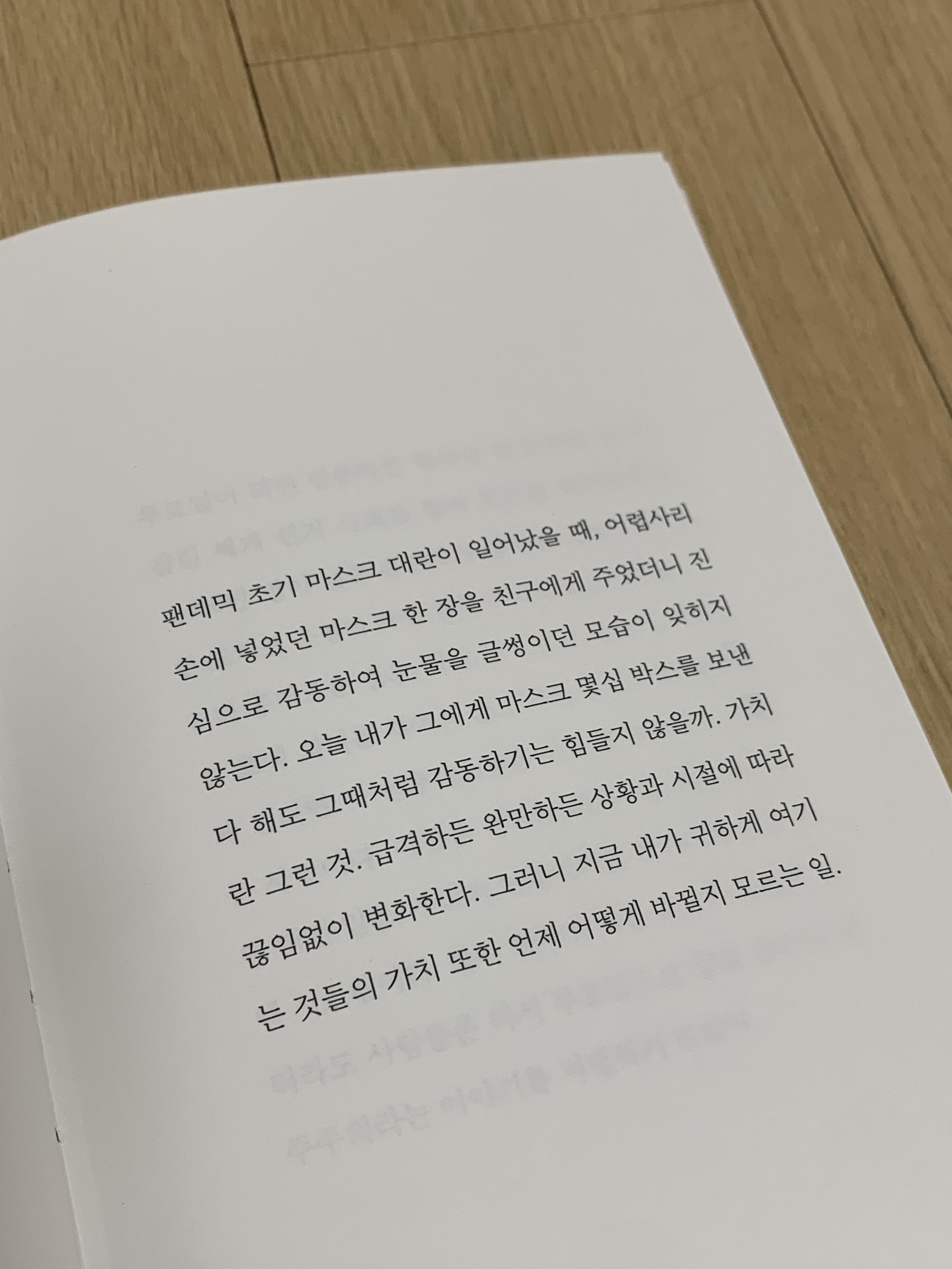 팬데믹 초기 마스크 대란이 일어났을 때, 어렵사리 손에 넣었던 마스크 한 장을 친구에게 주었더니 진심으로 감동하여 눈물을 글썽이던 모습이 잊히지 않는다. 오늘 내가 그에게 마스크 몇십 박스를 보낸다 해도 그때처럼 감동하기는 힘들지 않을까. 가치란 그런 것. 급격하든 완만하든 상황과 시절에 따라 끊임없이 변화한다. 그러니 지금 내가 귀하게 여기는 것들의 가치 또한 언제 어떻게 바뀔지 모르는 일.