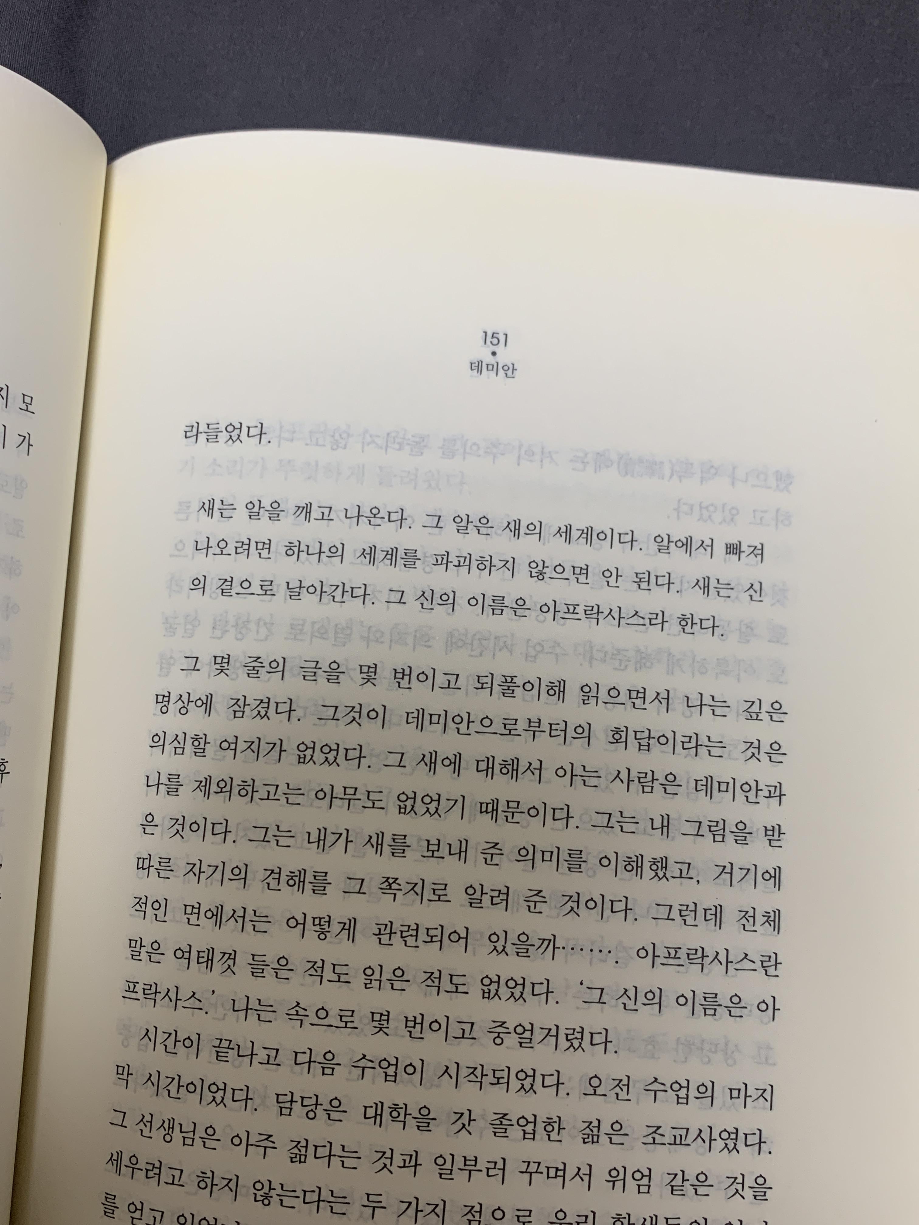 ‘새는 알을 깨고 나온다. 그 알은 새의 세계이다. 알에서 빠져 나오려면 하나의 세계를 파괴하지 않으면 안된다.'