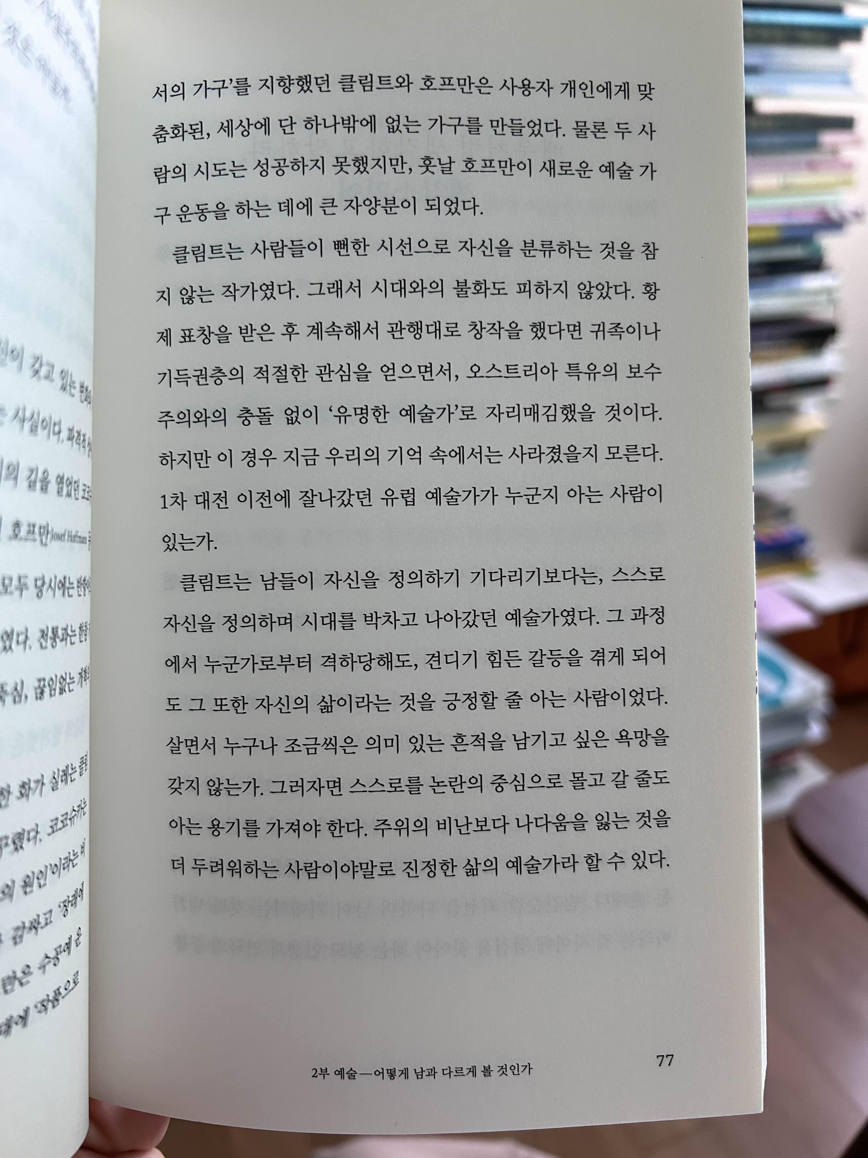 클림트는 남들이 자신을 정의하기 기다리기보다는, 스스로 자신을 정의하며 시대를 박차고 나아갔던 예술가였다. 그 과정에서 누군가로부터 격하당해도, 견디기 힘든 갈등을 겪게 되어도 그 또한 자신의 삶이라는 것을 긍정할 줄 아는 사람이었다. 살면서 누구나 조금씩은 의미 있는 흔적을 남기고 싶은 욕망을 갖지 않는가. 그러자면 스스로를 논란의 중심으로 몰고 갈 줄도 아는 용기를 가져야 한다. 주위의 비난보다 나다움을 잃는 것을 더 두려워하는 사람이야말로 진정한 삶의 예술가라 할 수 있다.