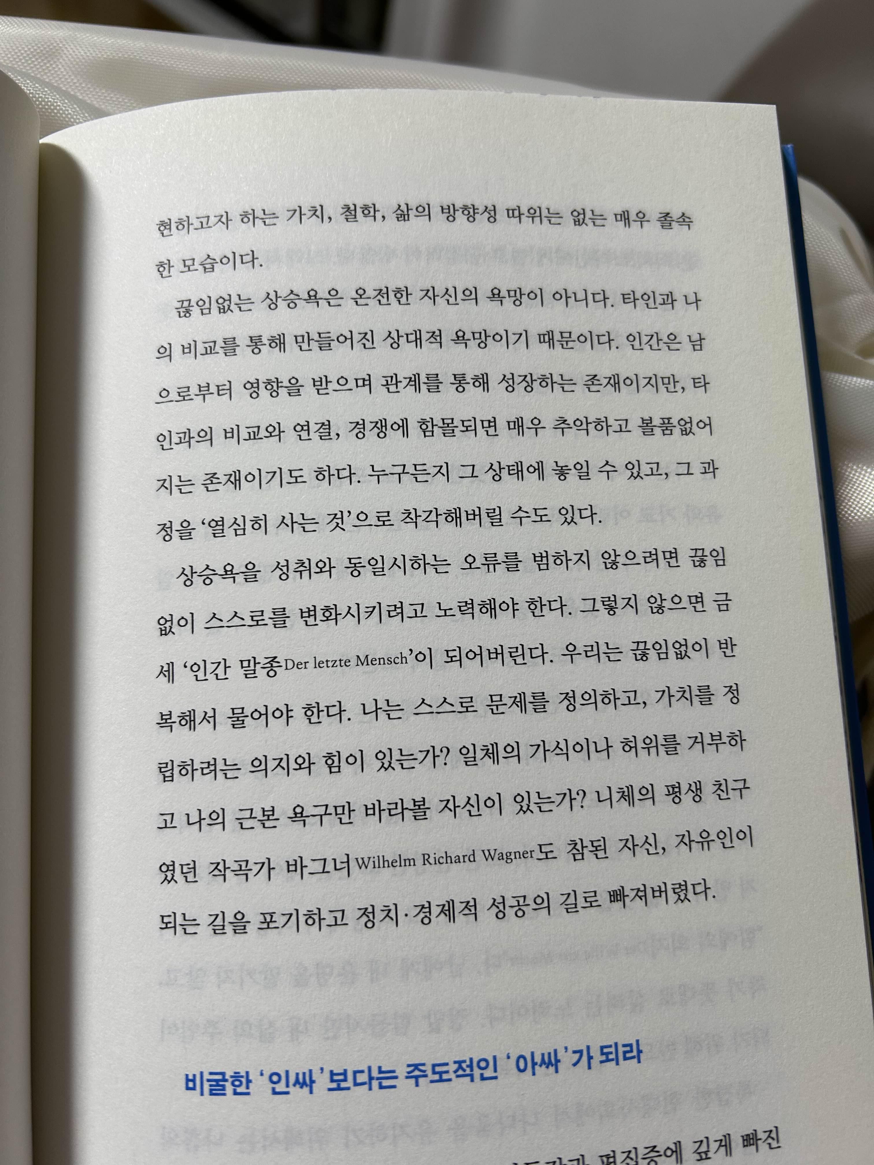 끊임없는 상승욕은 온전한 자신의 욕망이 아니다. 타인과 나의 비교를 통해 만들어진 상대적 욕망이기 때문이다. 인간은 남으로부터 영향을 받으며 관계를 통해 성장하는 존재이지만, 타인과의 비교 연결, 경쟁에 함몰되면 매우 추악하고 볼품없어지는 존재이기도 하다. 누구든지 그 상태에 놓일 수 있고, 그 과정을 '열심히 사는 것'으로 착각해버릴 수도 있다.