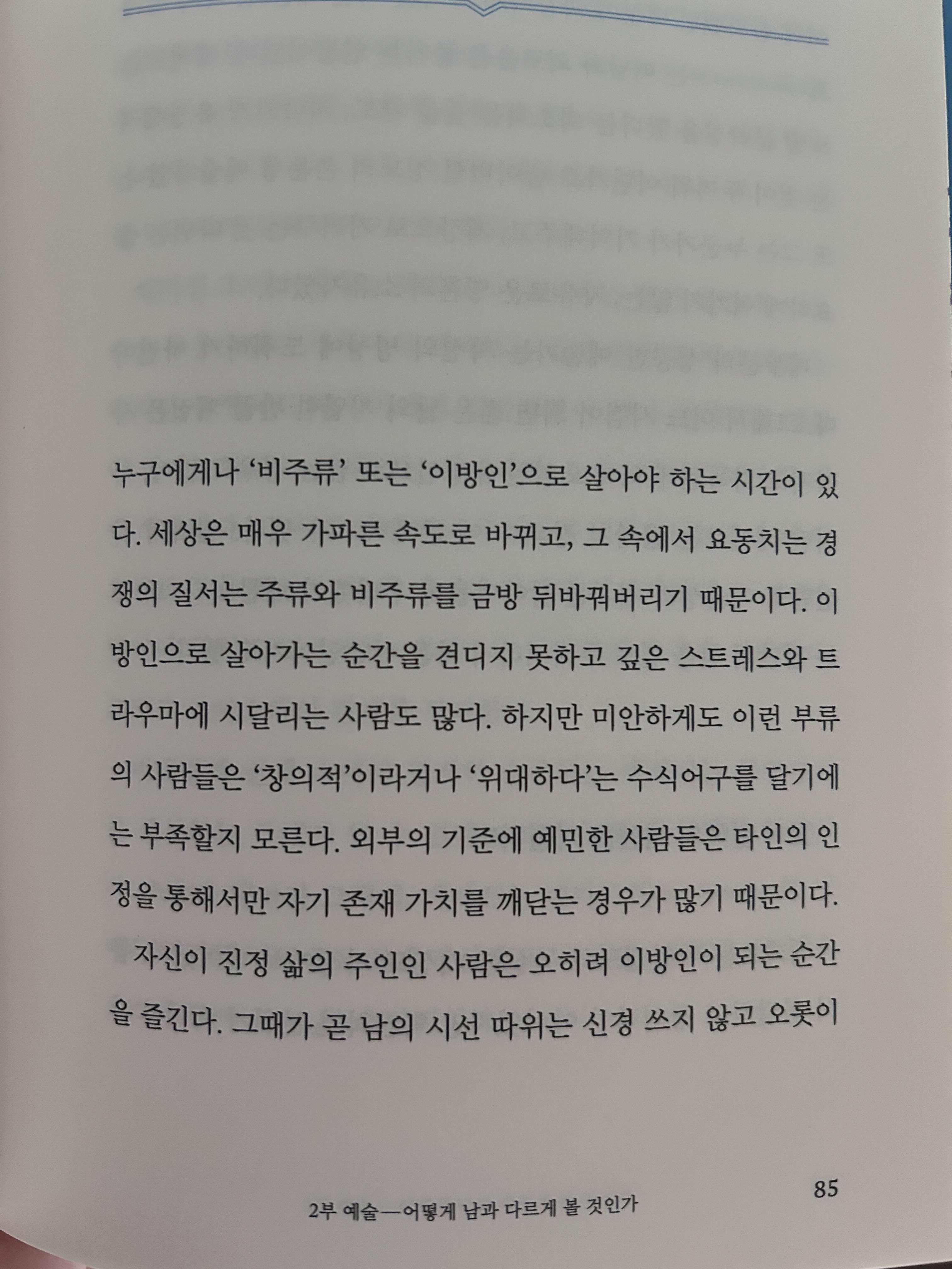 외부의 기준에 예민한 사람들은 타인의 인정을 통해서만 자기 존재 가치를 깨닫는 경우가 많다. 자신이 진정 삶의 주인인 사람은 무엇인가를 얻고 나면, 아주 잠깐 동안만 즐기고 그 다음으로 나가는 버릇이 들어 있다. 그렇다고 편안하게 살지 말라거나 쉬지 않고 끊임없이 노력하라는 이야기가 아니다. 삶의 과정에서 얻은 성과와 기득권에 취하지 말고 새로운 지향점을 볼 줄 아는 눈을 키우자는 것이다.