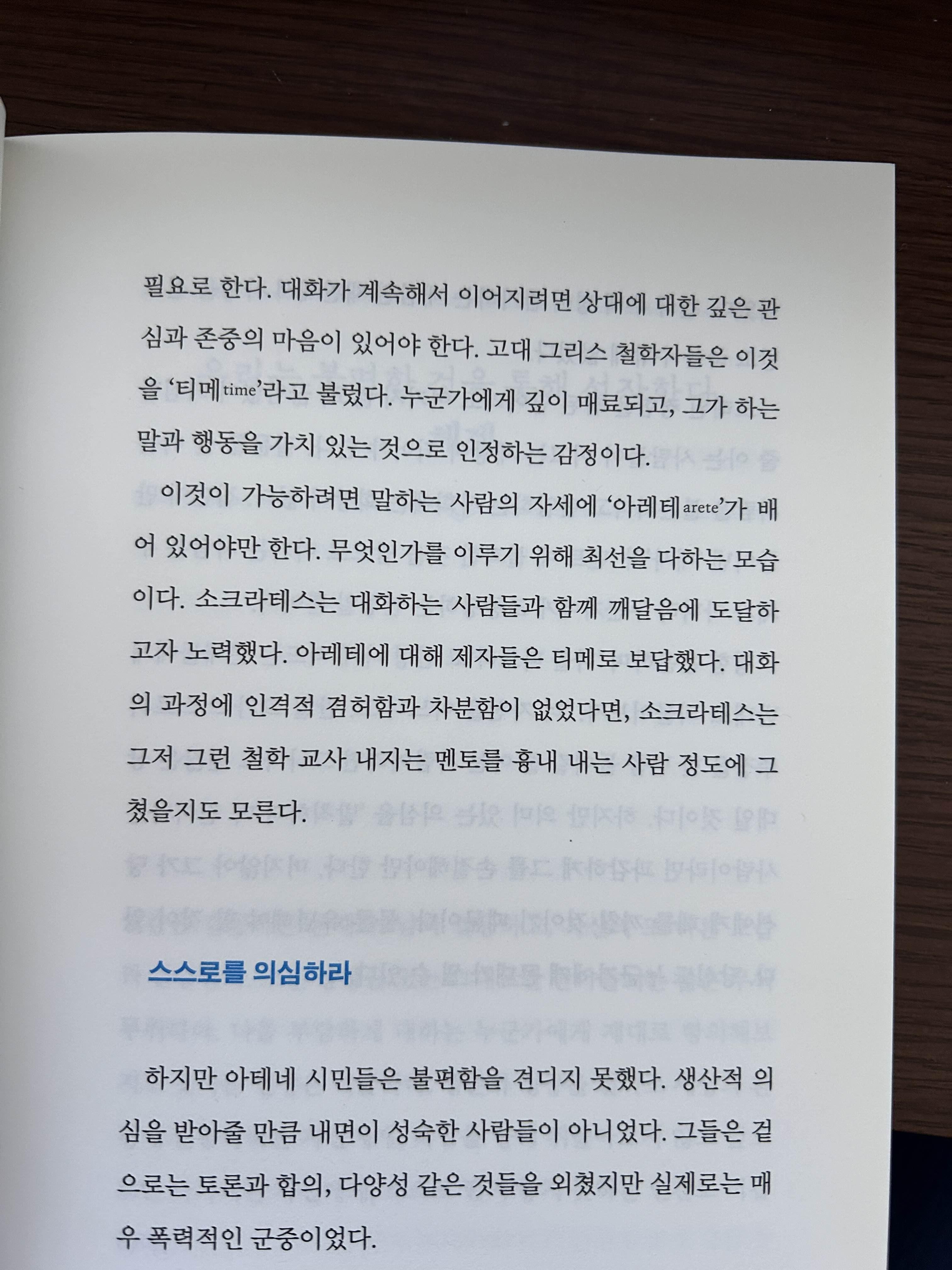 읽으며 울림이 있었던 부분. 대화가 계속해서 이어지려면 상대에 대한 깊은 관심과 존중의 마음이 있어야 한다고 한다. 고대 그리스 철학자들은 이것을 '티메(time)'라고 불렀다. 누군가에게 깊이 매료되고, 그가 하는 말과 행동을 가치 있는 것으로 인정하는 감정이다.