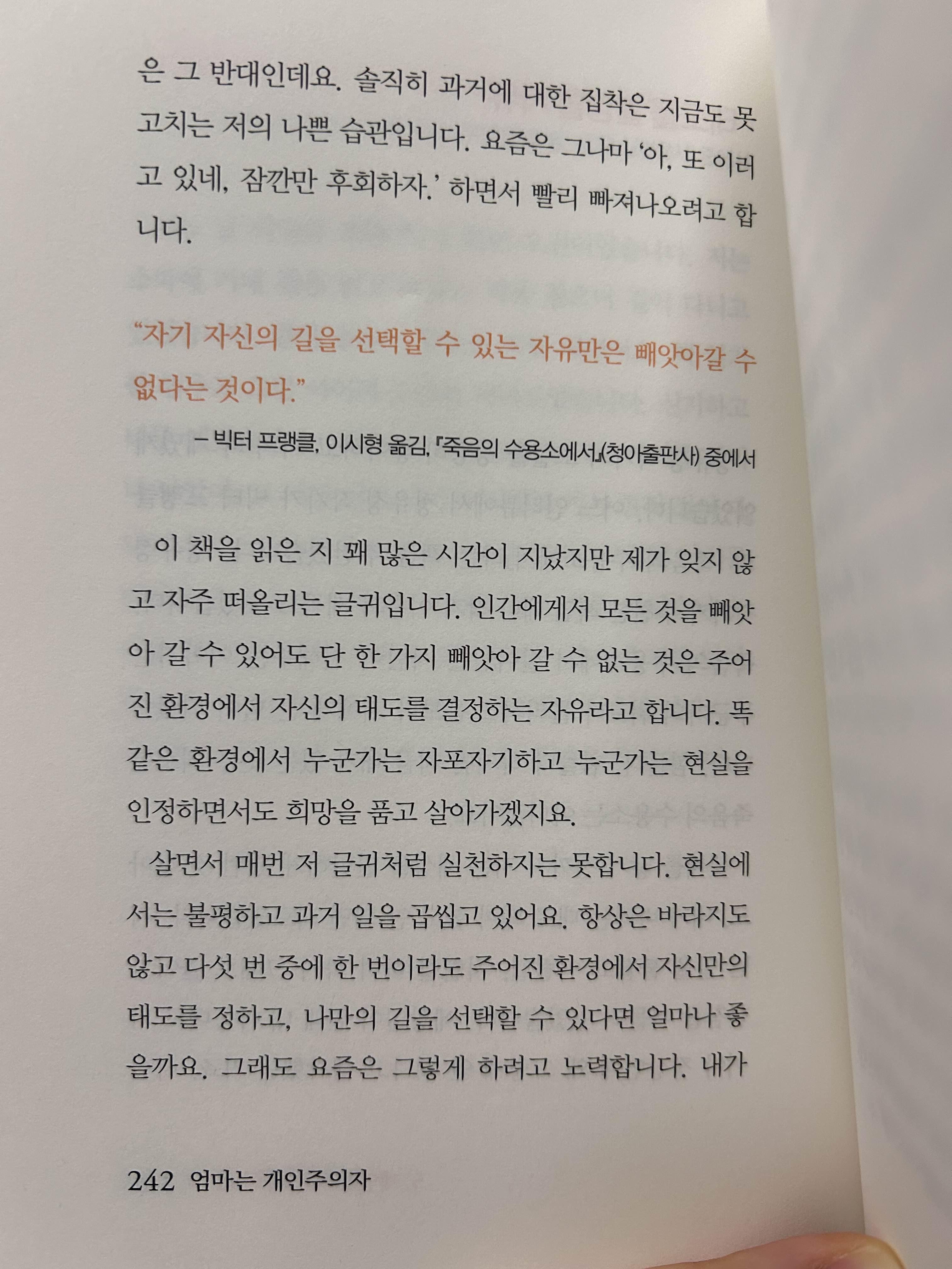 주어진 환경에서 자신의 태도를 결정하는 자유. 주어진 환경에서 자신만의 태도를 정하고, 나만의 길을 선택하는 것. 이전에 읽은 '몰입의 즐거움'에서도 같은 맥락의 내용이 언급된 적 있다.