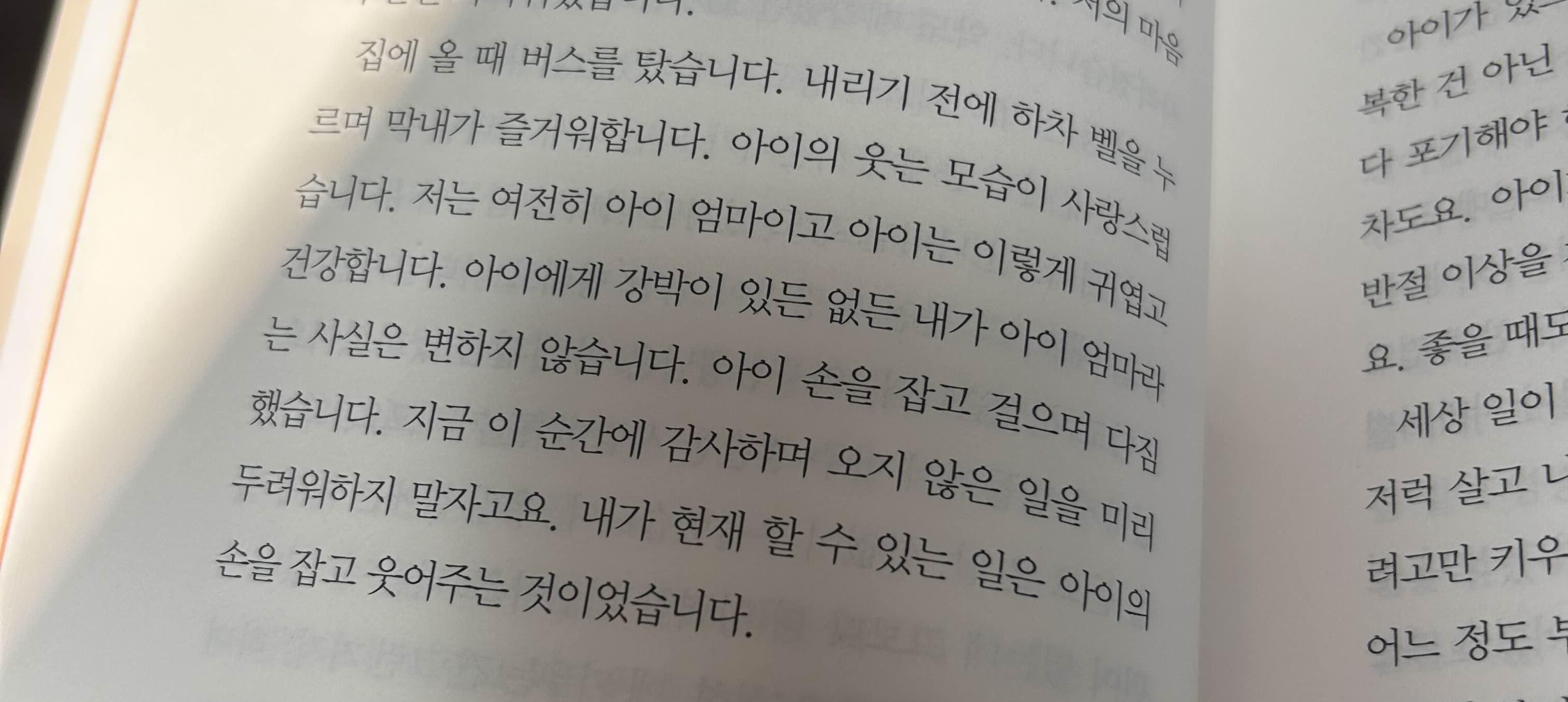 아이에게 강박이 있든 없든 내가 아이 엄마라는 사실은 변하지 않습니다. 아이 손을 잡고 걸으며 다짐했습니다. 지금 이 순간에 감사하며 오지 않은 일을 미리 두려워하지 말자고요. 내가 현재 할 수 있는 일은 아이의 손을 잡고 웃어주는 것이었습니다.