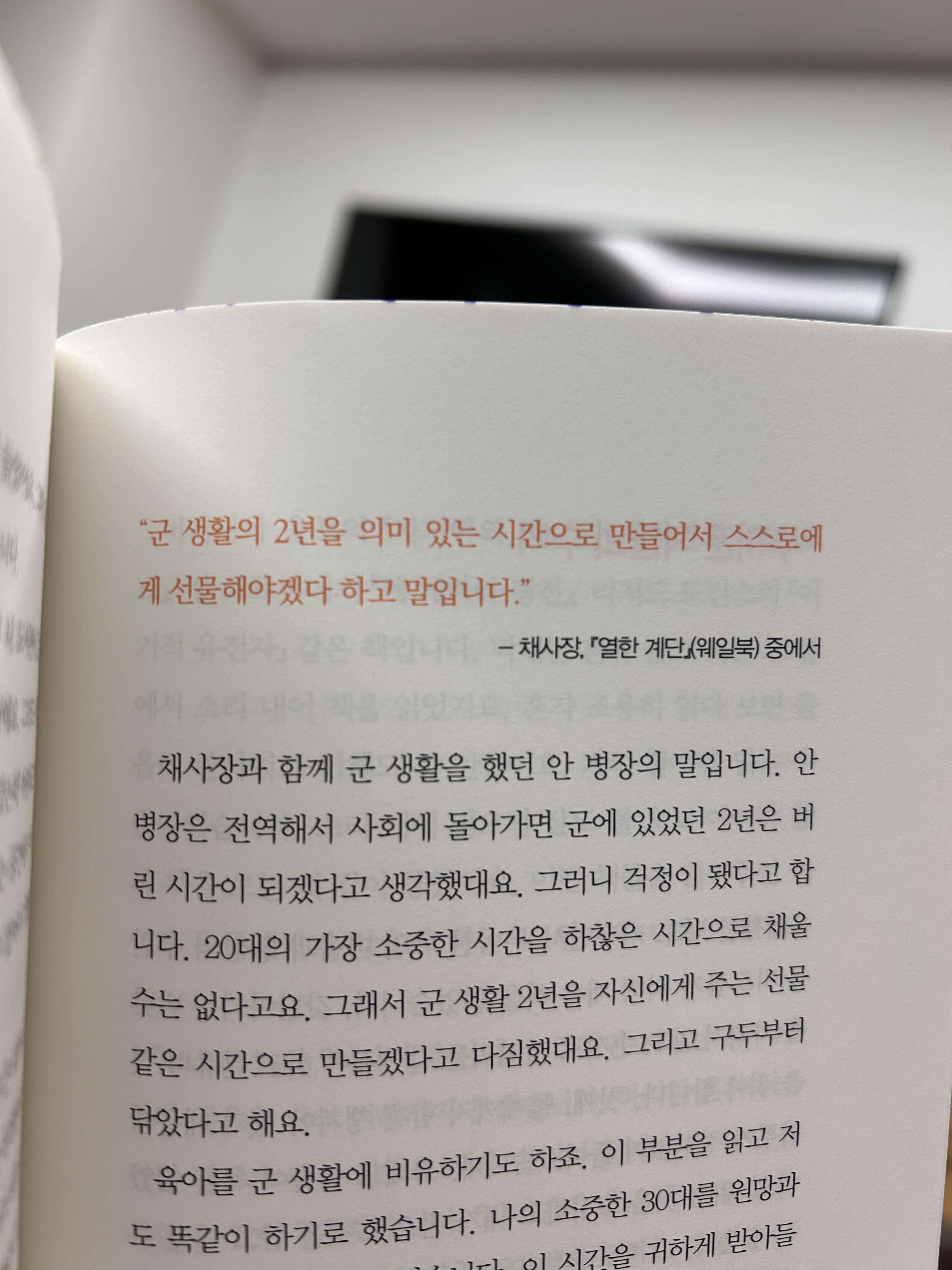 자극 받았던 문단 중 하나. '군 생활의 2년을 의미 있는 시간으로 만들어서 스스로에게 선물해야겠다 하고 말입니다.' 출산/육아 휴직을 앞두고 우리 아이를 건강하게 키우는것도 중요하나 내 커리어를 생각하다보니 우울해졌다. 다른 사람들 보다 뒤쳐질 수 있다는 불안감과 긴 1년 4개월의 시간을 어떻게 보낼 것인가에 대한 고민이 많아졌다. 그래서 휴직동안 부족한 부분을 채우고 싶은 분야(커리어, 육아, 가정, 자기계발 등)를 정리하고 구체적인 계획을 정리해보았다. 위 문장과 같이 성실하게 꾸준히 실행하여 1년 4개월 동안 값진 선물을 나에게 해보고자 한다.