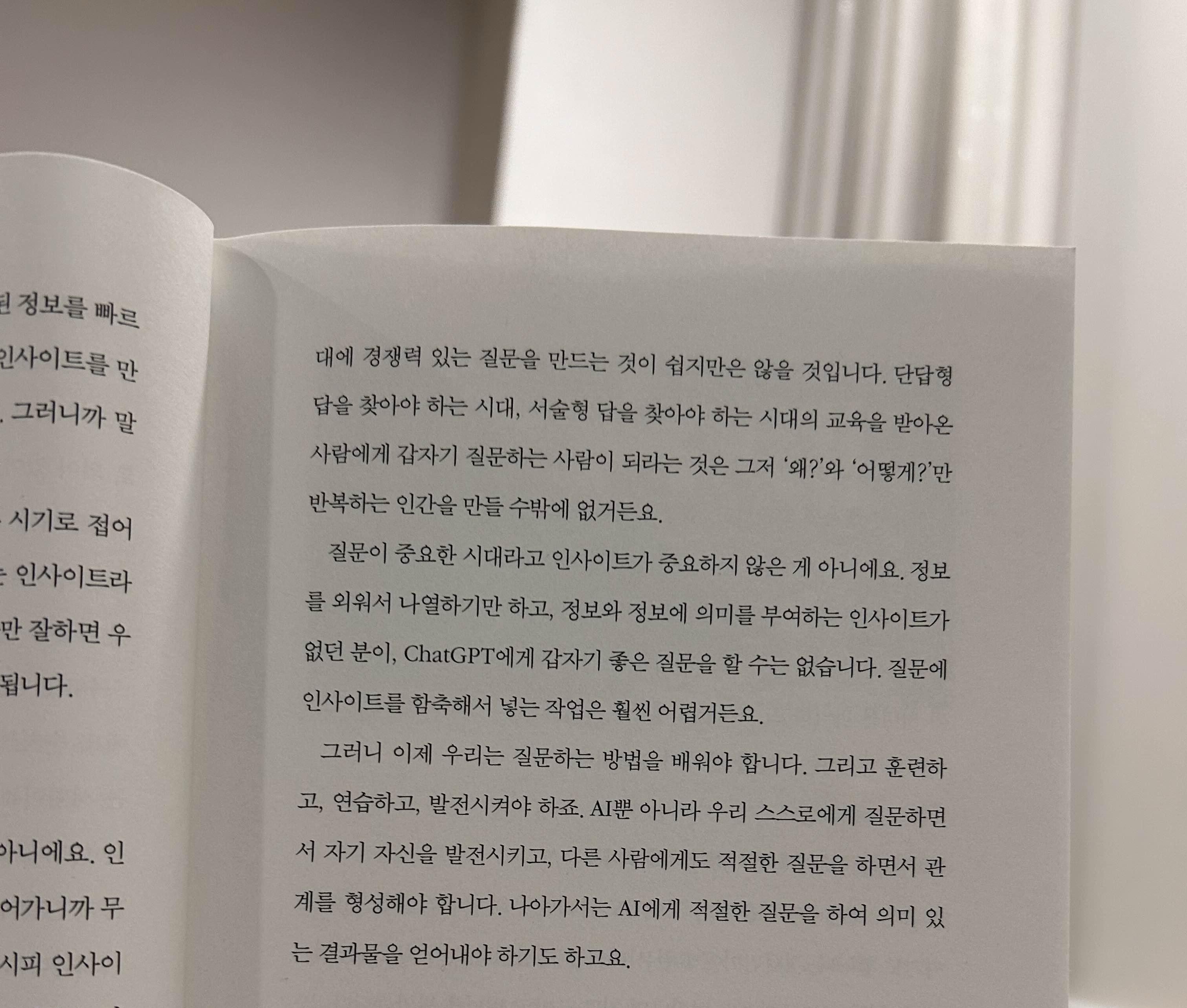 정보를 외워서 나열하기만 하고, 정보와 정보에 의미를 부여하는 인사이트가 없던 분이, ChatGPT에게 갑자기 좋은 질문을 할 수는 없습니다. (…) 이제 우리는 질문하는 방법을 배워야 합니다.