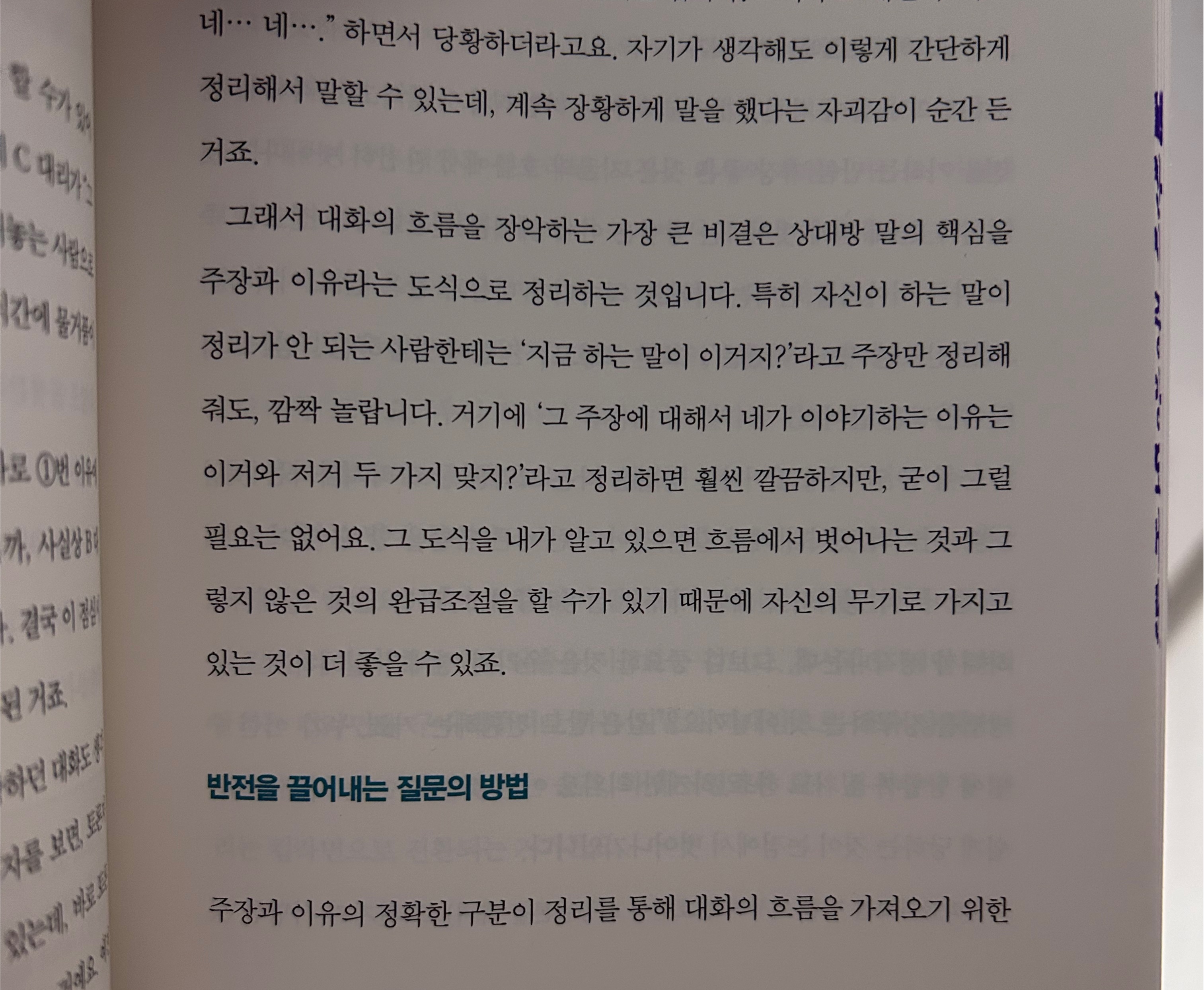 대화의 흐름을 장악하는 가장 큰 비결은 상대방 말의 핵심을 주장과 이유라는 도식으로 정리하는 것입니다.