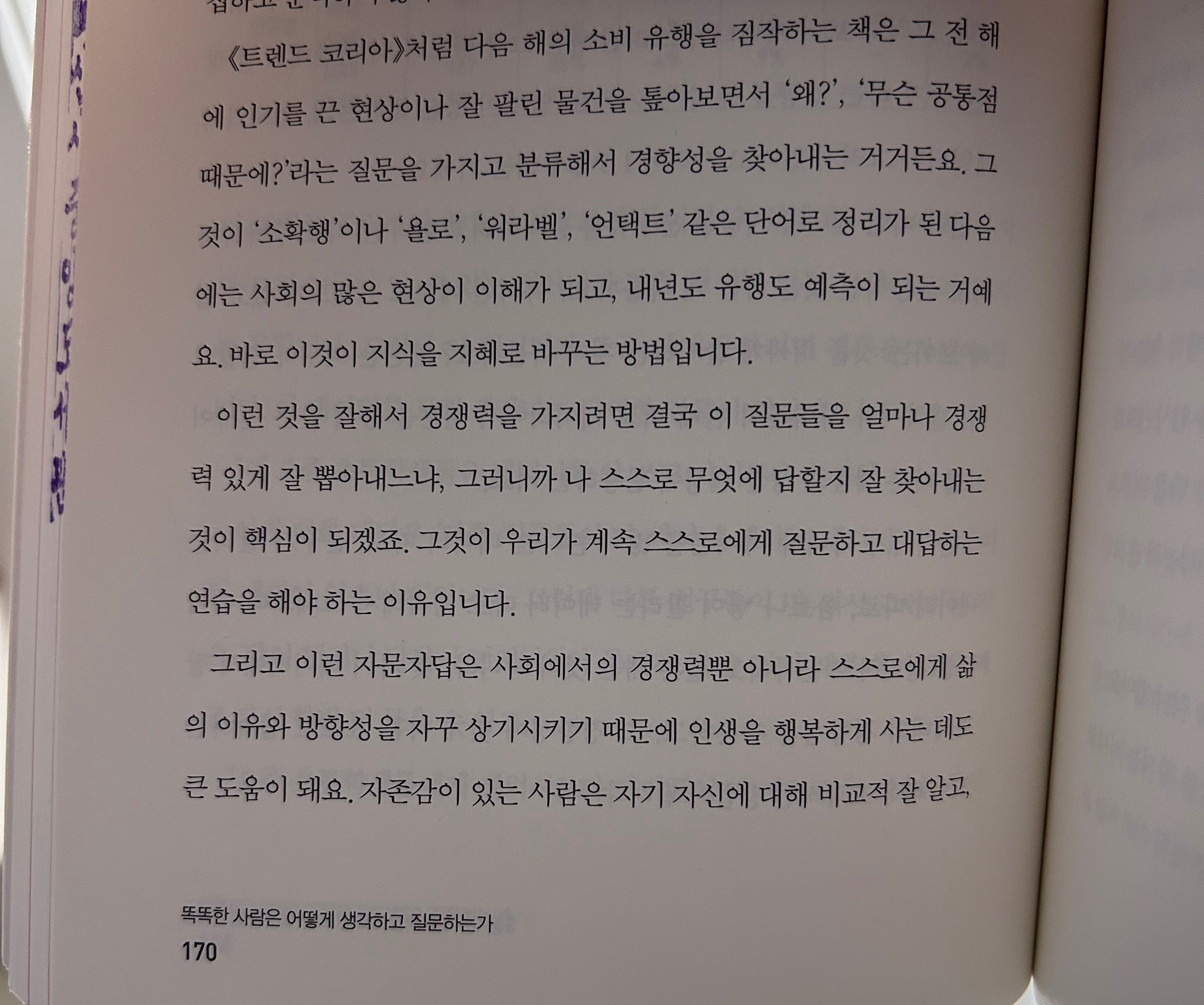 그리고 이런 자문자답은 사회에서의 경쟁력뿐 아니라 스스로에게 삶의 이유와 방향성을 자꾸 상기시키기 때문에 인생을 행복하게 사는 데도 큰 도움이 돼요.