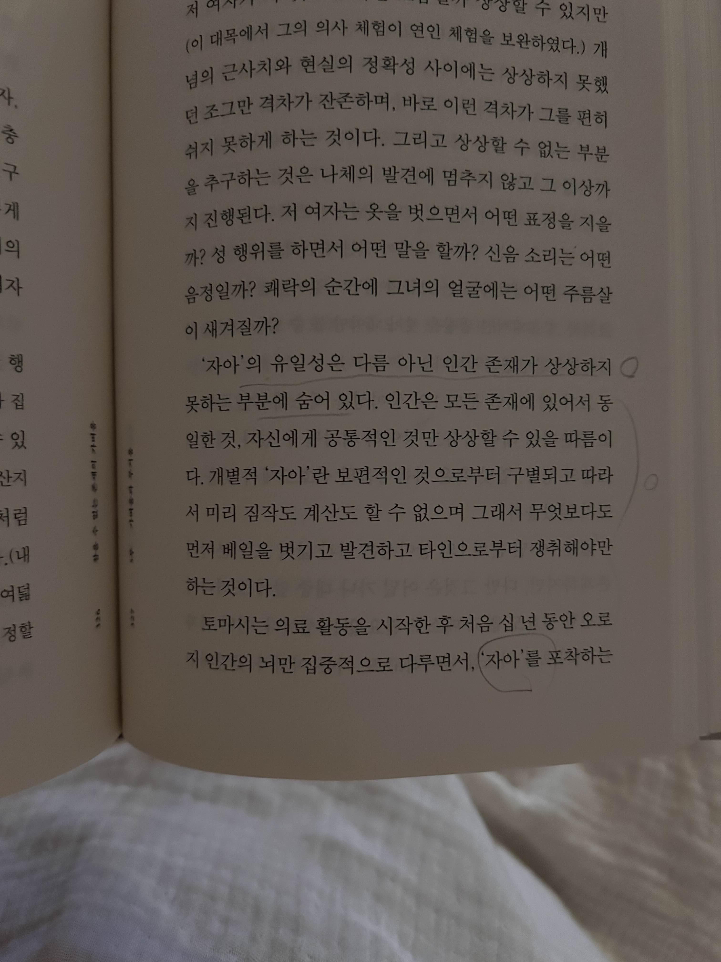 ‘자아’의 유일성은 다름 아닌 인간 존재가 상상하지 못하는 부분에 숨어 있다. 인간은 모든 존재에 있어서 동일한 것, 자신에게 공통적인 것만 상상할 수 있을 따름이다. 개별적 ‘자아’란 보편적인 것으로부터 구별되고 따라서 미리 짐작도 계산도 할 수 없으며 그래서 무엇보다도 먼저 베일을 벗기고 발견하고 타인으로부터 쟁취해야만 하는 것이다.