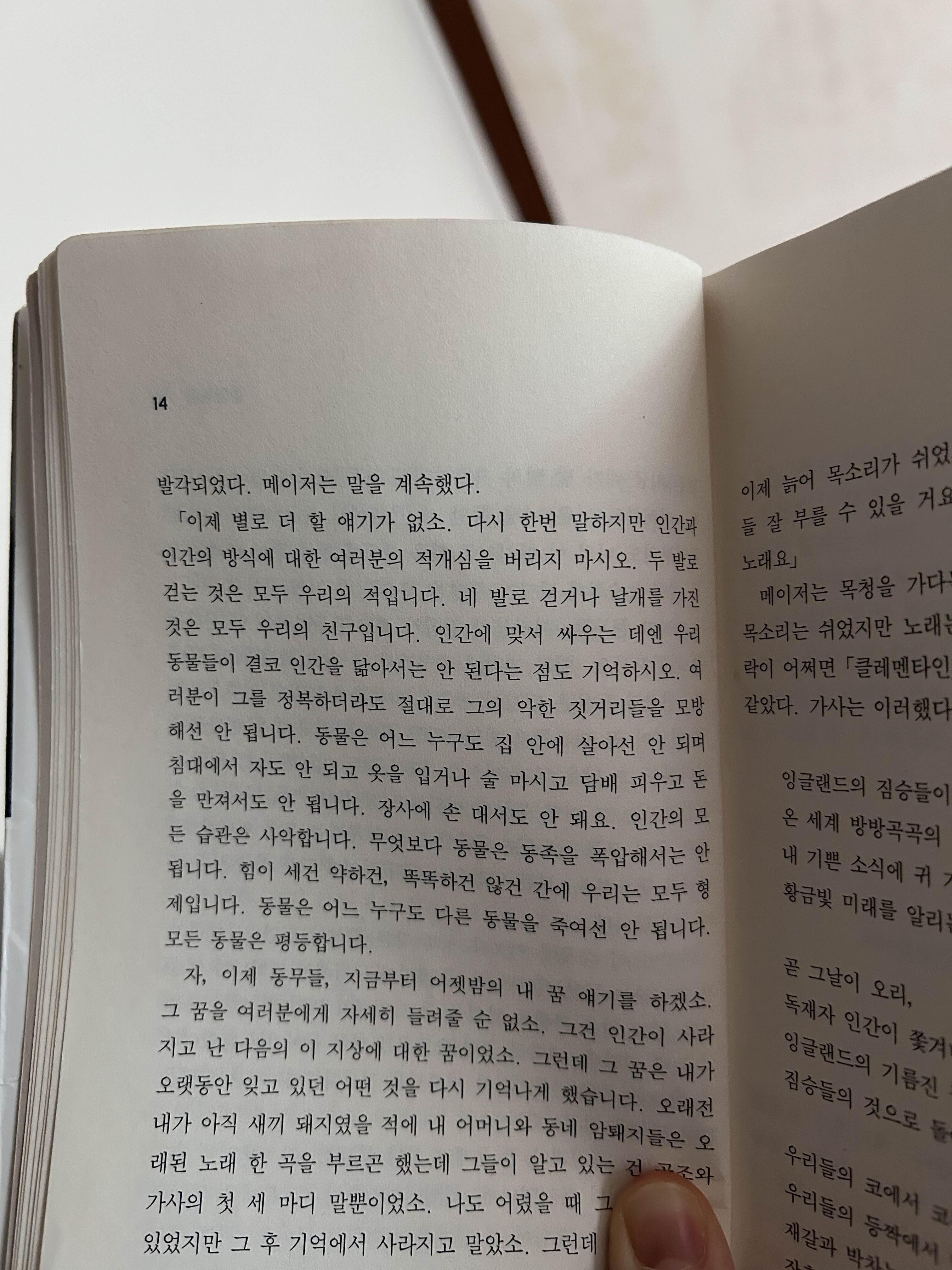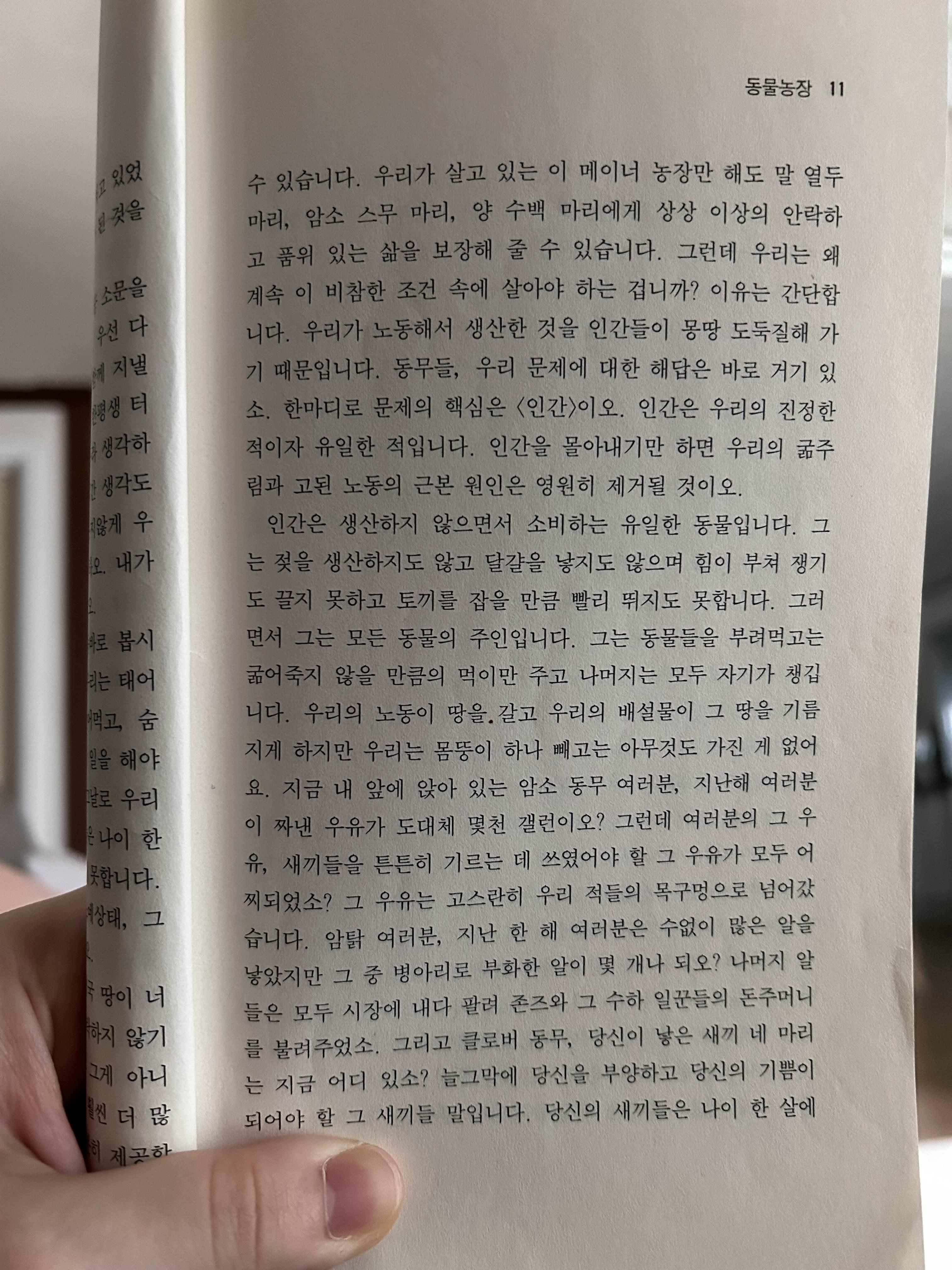 한 마디로 문제의 핵심은 <인간>이오. 인간은 우리의 진정한 적이자 유일한 적입니다. ... 인간은 생산하지 않으면서 소비하는 유일한 동물입니다. 그는 젖을 생산하지도 않고 달걀을 낳지도 않으며 힘이 부쳐 쟁기도 끌지 못하고 토끼를 잡을 만큼 빨리 뛰지도 못합니다. 그러면서 그는 모든 동물의 주인입니다. 그는 동물들을 부려먹고는 굶어죽지 않을 만큼의 먹이만 주고 나머지는 모두 자기가 챙깁니다.