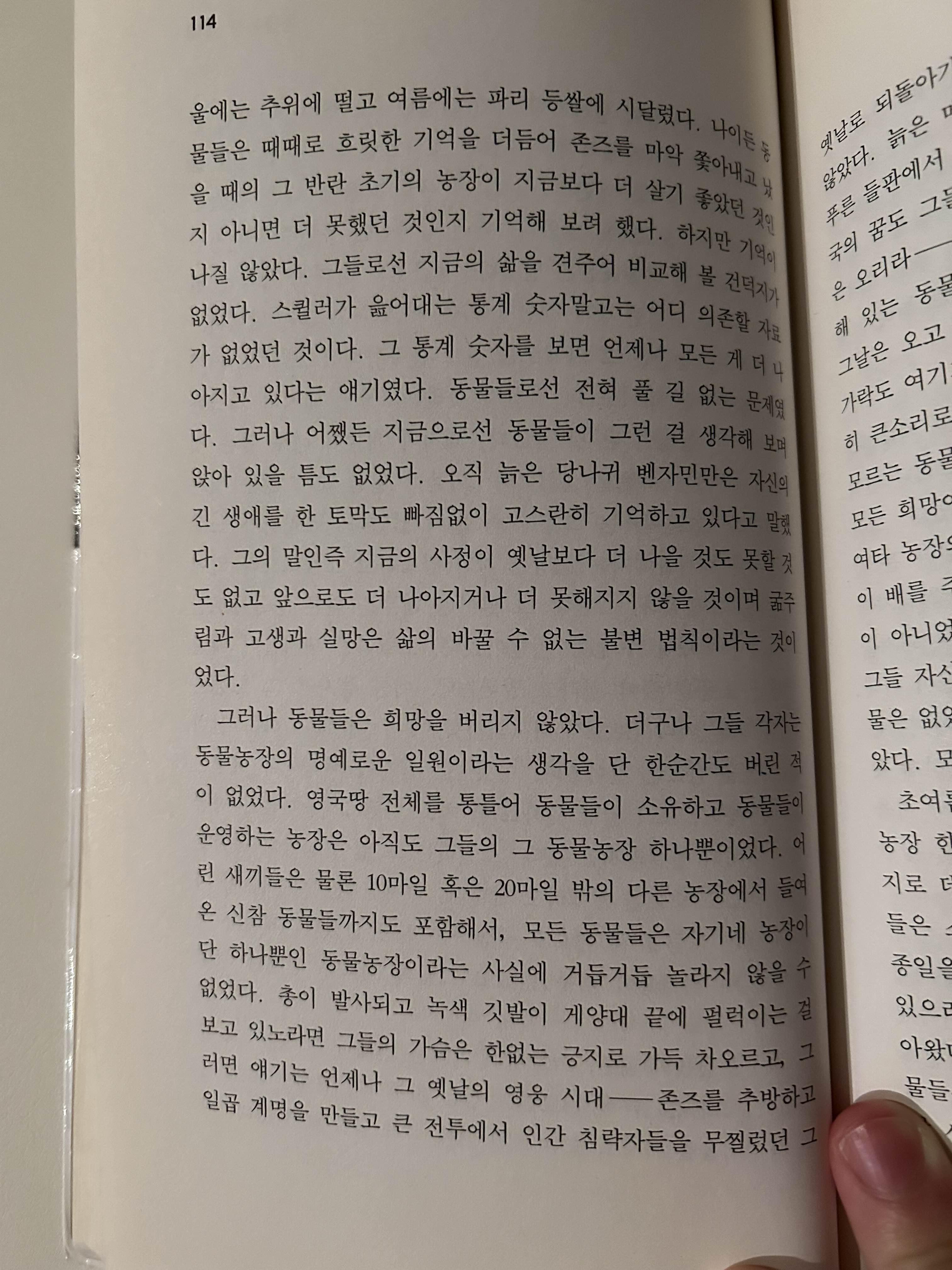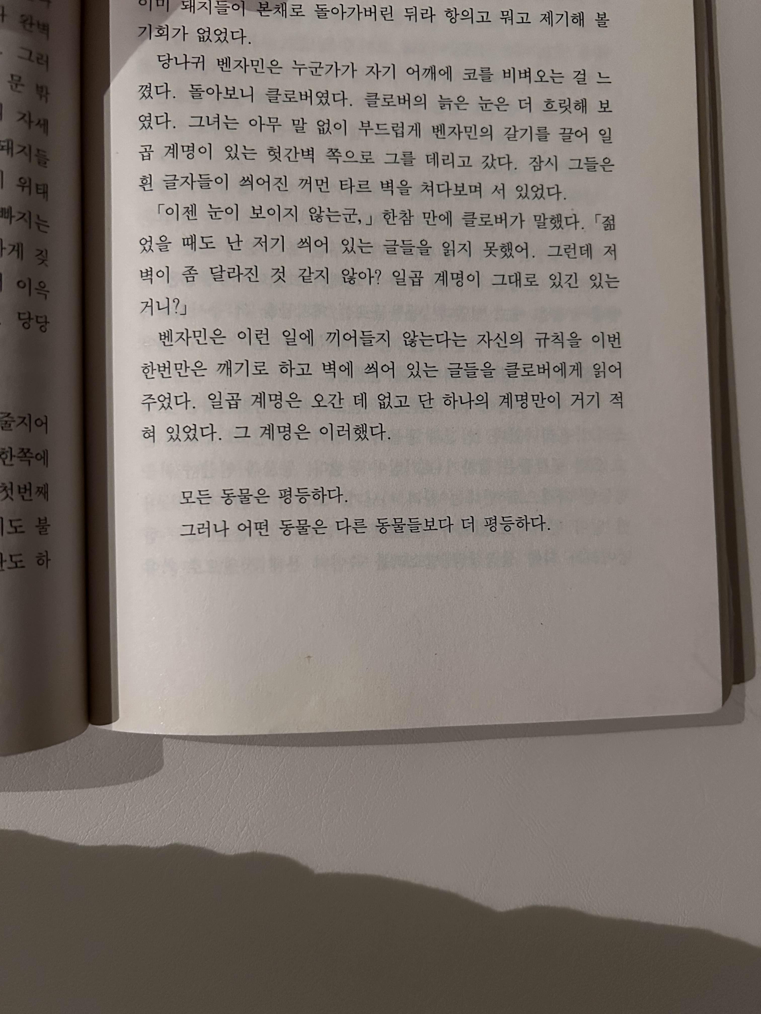 나이든 동물들은 때때로 흐릿한 기억을 더듬어 존즈를 마악 쫓아내고 났을 때의 그 반란 초기의 농장이 지금보다 더 살기 좋았던 것인지 아니면 더 못했던 것인지 기억해 보려 했다. 하지만 기억이 나질 않았다. 그들로선 지금의 삶을 견주어 비교해 볼 건덕지가 없었다. ... 오직 늙은 당나귀 벤자민만은 자신의 긴 생애를 한 토막도 빠짐없이 고스란히 기억하고 있다고 말했다. 그의 말인즉 지금의 사정이 옛날보다 더 나을 것도 못할 것도 없고 앞으로도 더 나아지거나 더 못해지지 않을 것이며 굶주림과 고생과 실망은 삶의 바꿀 수 없는 불변 법칙이라는 것이었다.