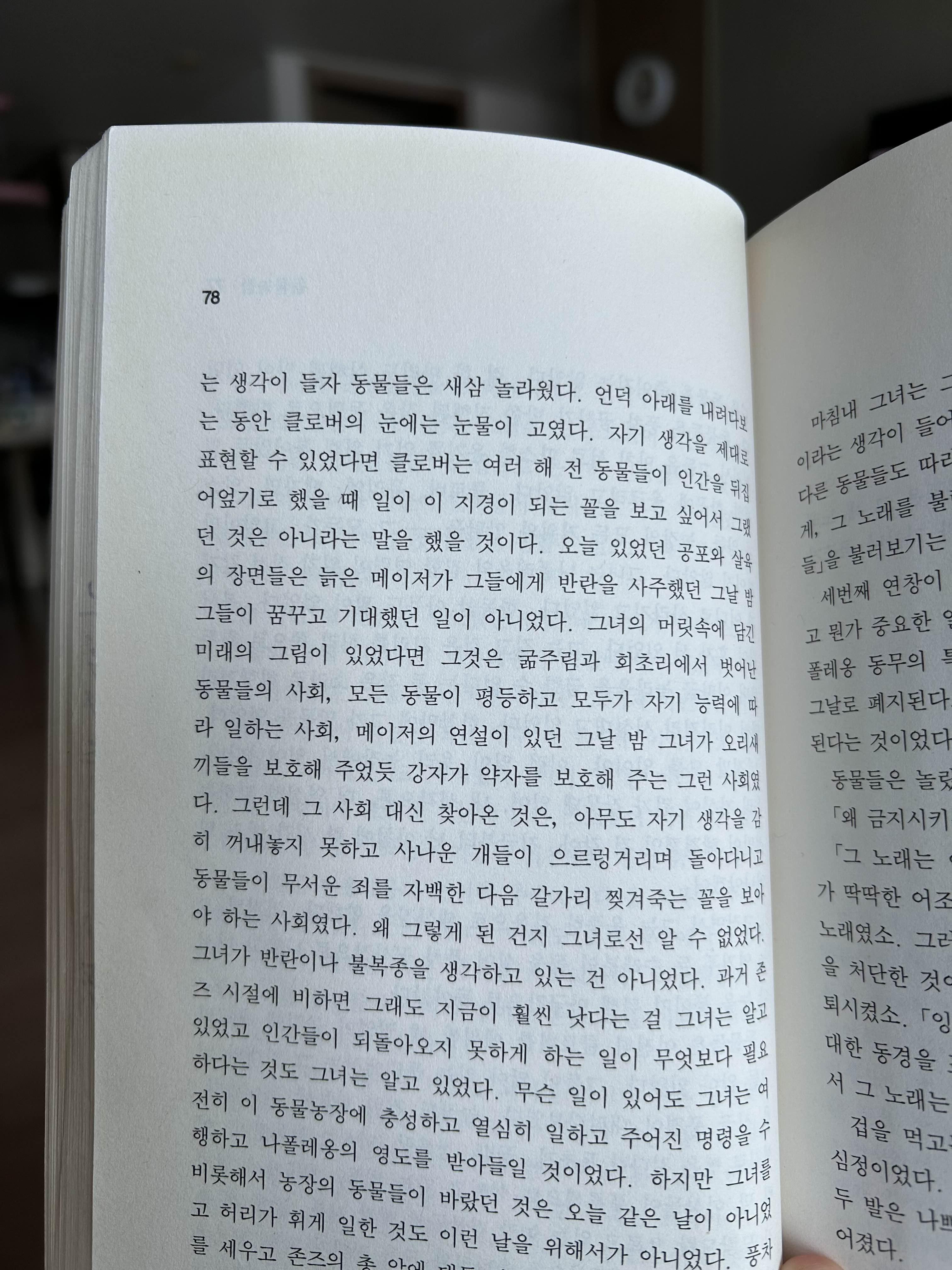 오늘 있었던 공포와 살육의 장면들은 늙은 메이저가 그들에게 반란을 사주했던 그날 밤 그들이 꿈꾸고 기대했던 일이 아니었다. 그녀의 머릿속에 담긴 미래의 그림이 있었다면 그것은 굶주림과 회초리에서 벗어난 동물들의 사회, 모든 동물이 평등하고 모두가 자기 능력에 따라 일하는 사회, 메이저의 연설이 있던 그날 밤 그녀가 오리새끼들을 보호해 주었듯 강자가 약자를 보호해 주는 그런 사회였다.