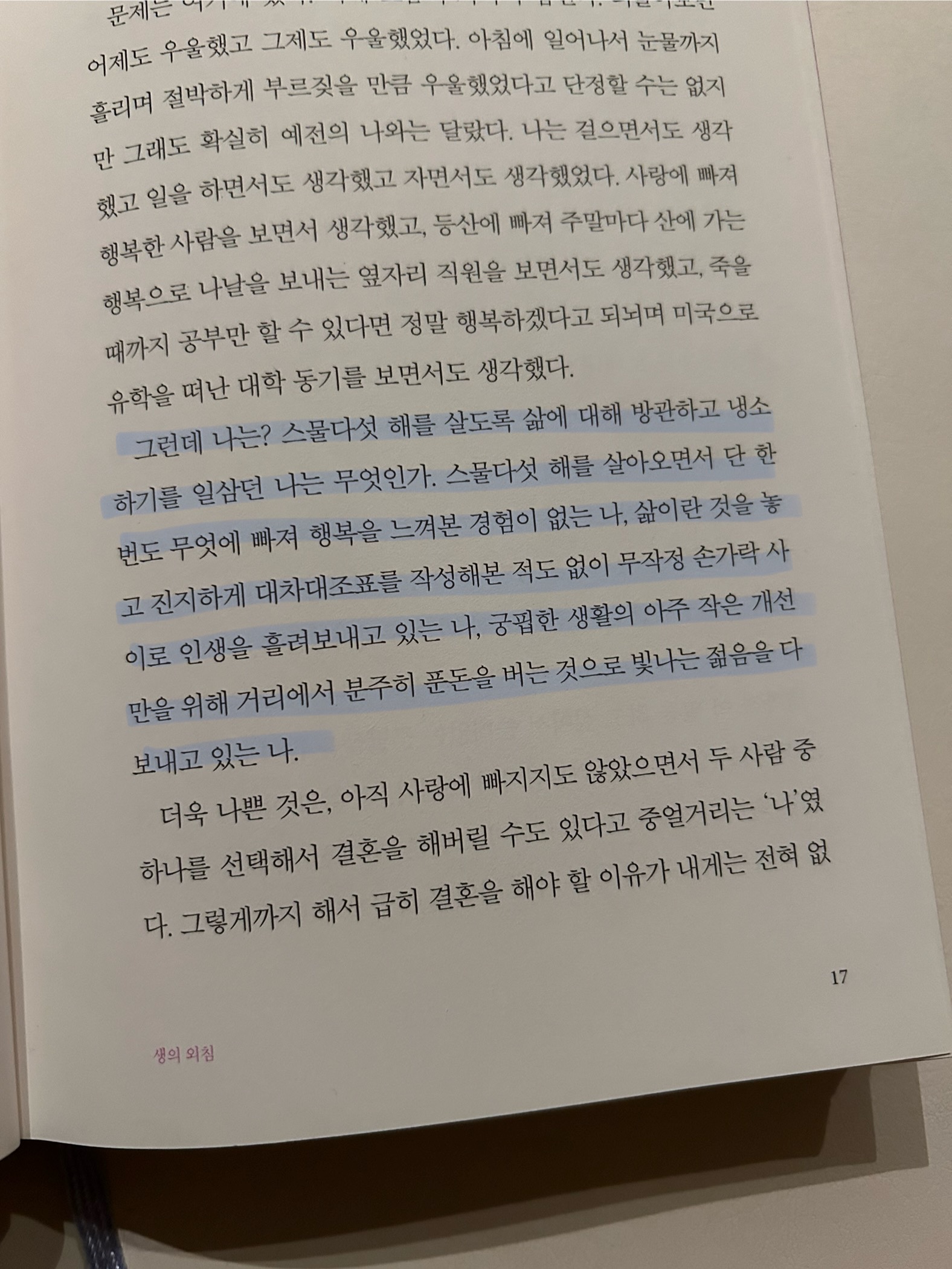 그런데 나는? 스물다섯 해를 살도록 삶에 대해 방관하고 냉소하기를 일삼던 나는 무엇인가. 스물다섯 해를 살아오면서 단 한번도 무엇에 빠져 행복을 느껴본 경험이 없는 나, 삶이란 것을 놓고 진지하게 대차대조표를 작성해본 적도 없이 무작정 손가락 사이로 인생을 흘려보내고 있는 나, 궁핍한 생활의 아주 작은 개선만을 위해 거리에서 분주히 푼돈을 버는 것으로 빛나는 젊음을 다 보내고 있는 나.
