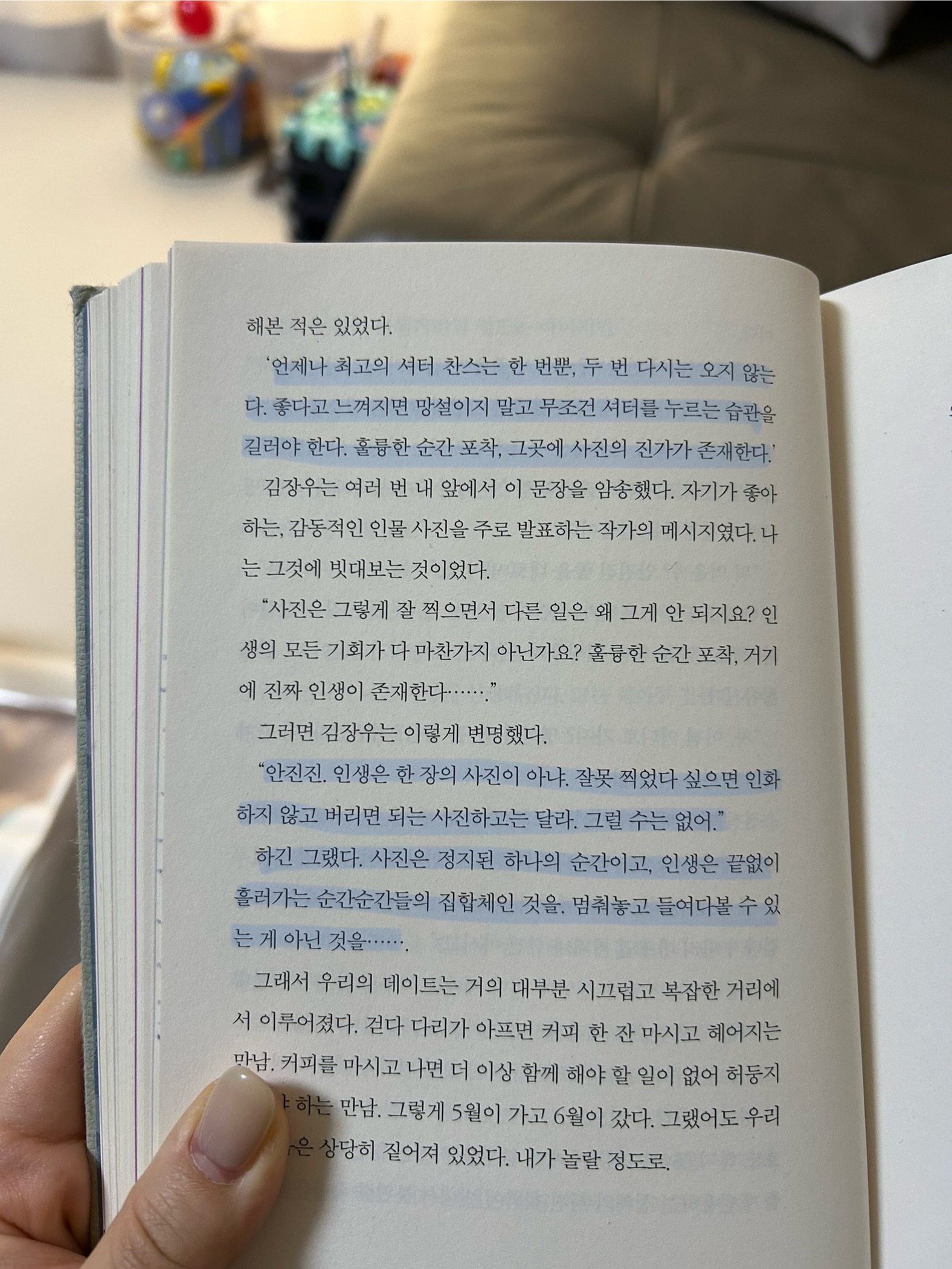 하긴 그랬다. 사진은 정지된 하나의 순간이고, 인생은 끝없이 흘러가는 순간순간들의 집합체인 것을, 멈춰놓고 들여다볼 수 있는 게 아닌 것을...