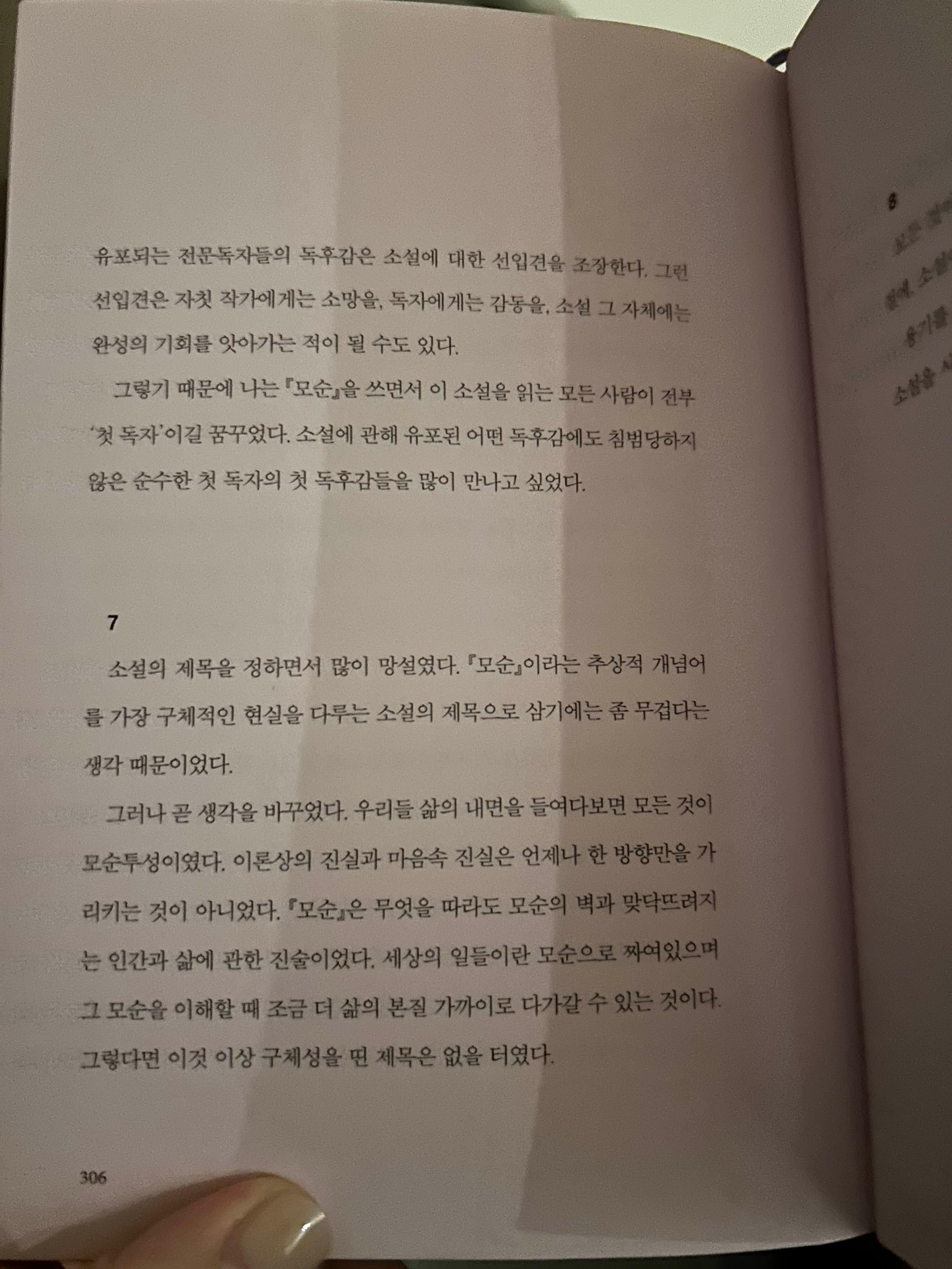 우리들 삶의 내면을 들여다보면 모든 것이 모순투성이였다. 이론상의 진실과 마음속 진실은 언제나 한 방향만을 가리키는 것이 아니었다. '모순'은 무엇을 따라도 모순의 벽과 맞닥뜨려지는 인간과 삶에 관한 진술이었다. 세상의 일들이란 모순으로 짜여있으며 그 모순을 이해할 때 조금 더 삶의 본질 가까이로 다가갈 수 있는 것이다.