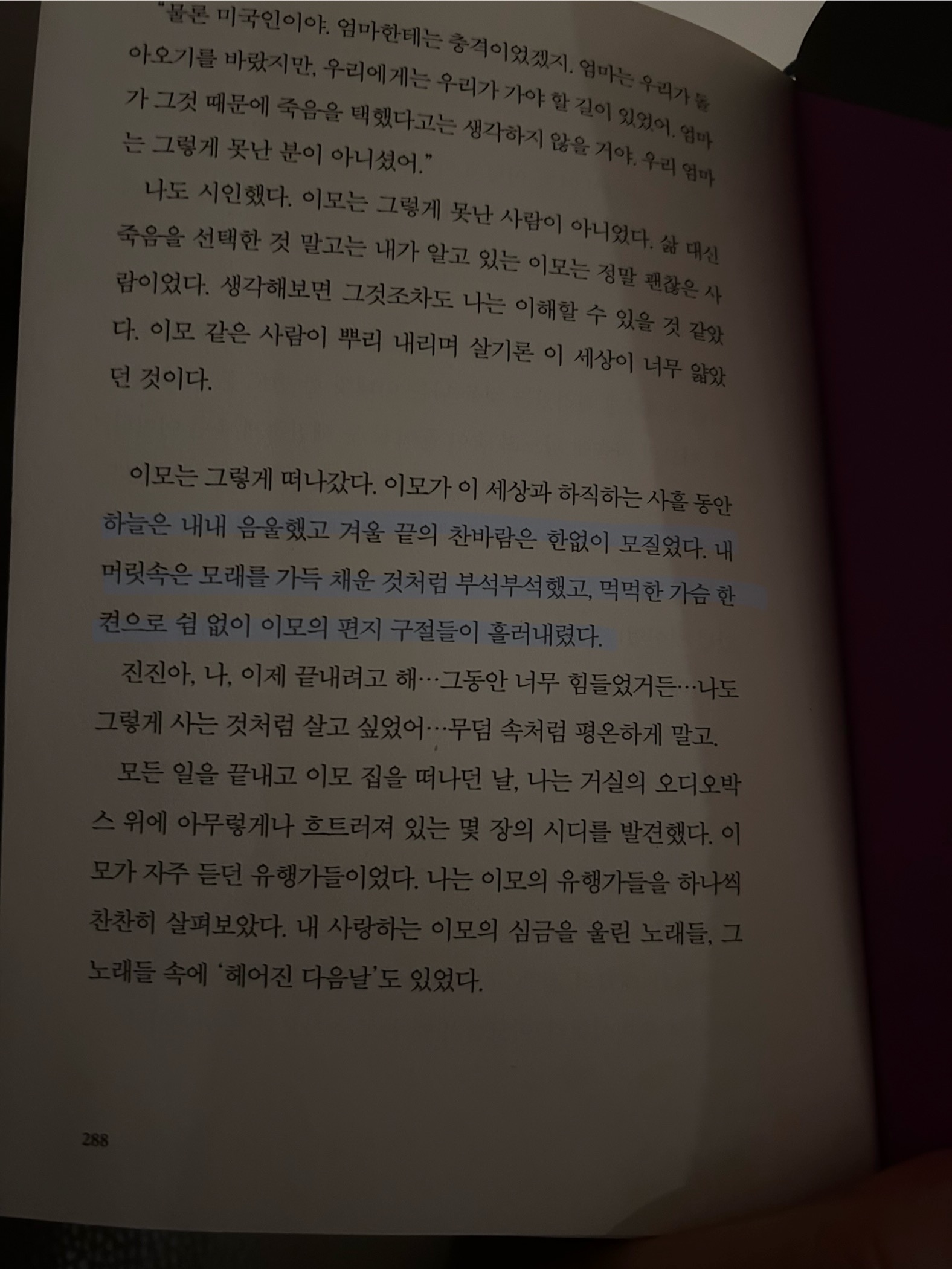 하늘은 내내 음울했고 겨울 끝의 찬바람은 한없이 모질었다. 내 머릿속은 모래를 가득 채운 것처럼 부석부석했고, 먹먹한 가슴 한 켠으로 쉼 없이 이모의 편지 구절들이 흘러내렸다.