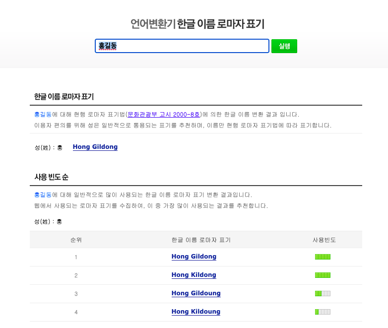 네이버에서는 한글 이름 로마자 표기법과 일반적으로 많이 사용되고 있는 로마자 표기 결과를 알 수 있다.