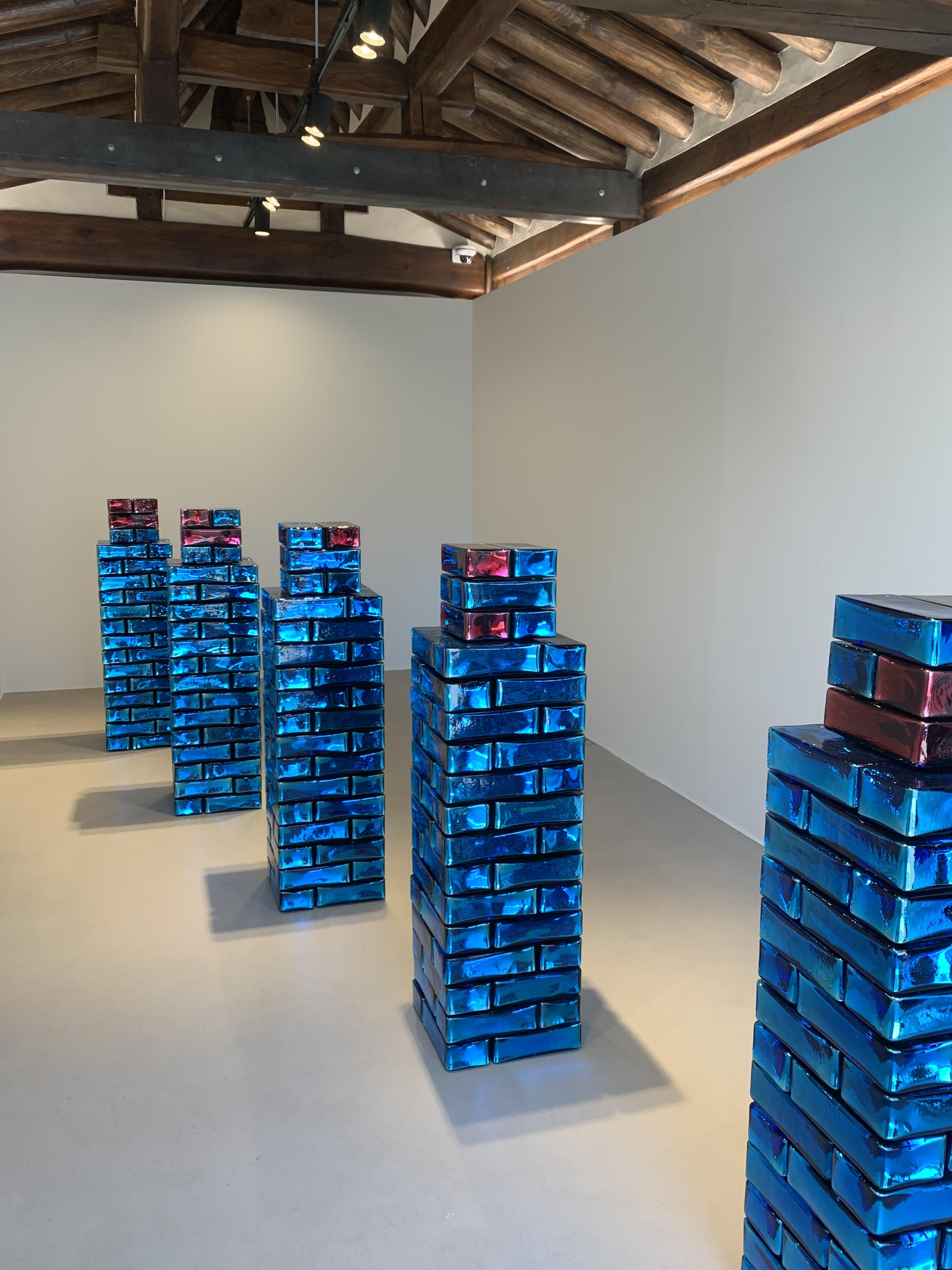 이번 전시는 블록 형태의 작품들로 구성된다. 모듈인 낱개의 유리 벽돌들이 모여 하나의 블록을 만드는데, 오랫동안 인류 문명의 발전에서 중요한 역할을 한 벽돌은 장 미셸 오토니엘에게도 핵심적인 조형 요소로 자리매김해왔다.