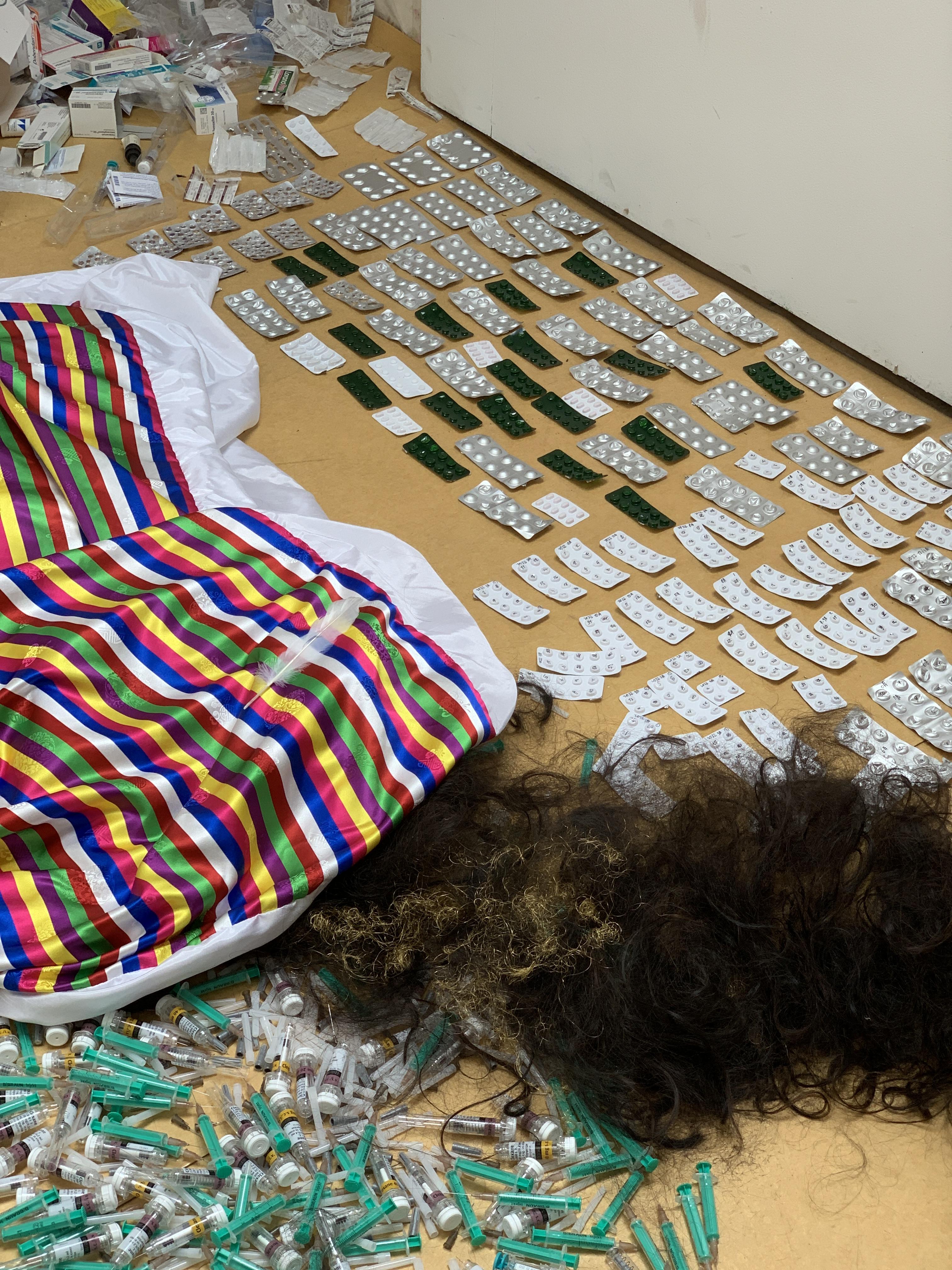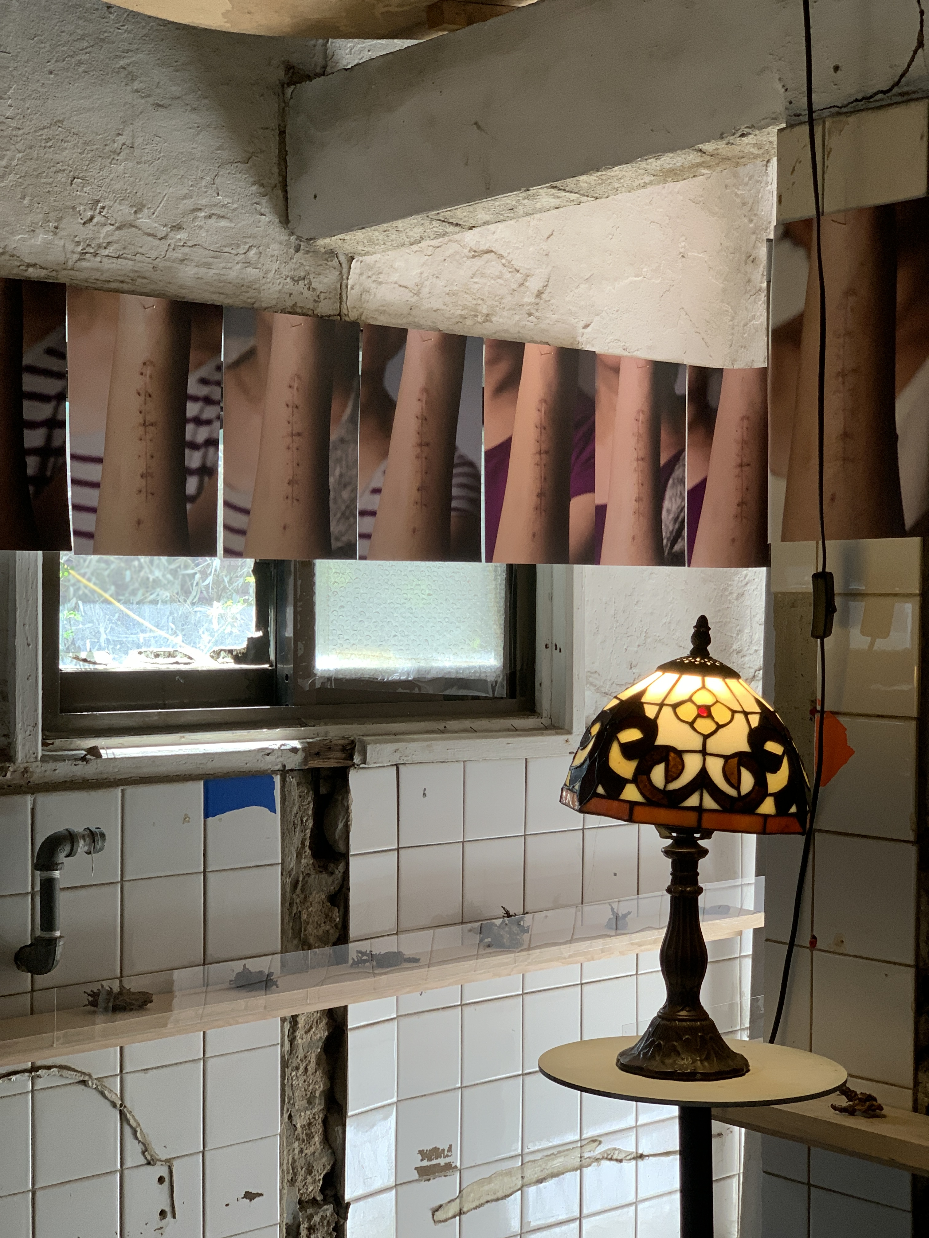 항암은 다분히 폭력적인 치료이다. 독한 약이 몸에 퍼지는 동안 통증과 신열에 시달리고 정신이 들면 도둑맞은 현재가 서럽다. 치료가 진행될수록 몸은 엉망이 된다. 가슴은 잘리고 피부는 그을고 딱딱하게 갈리지며 머리카락은 빠진다. 전시장 바닥에 나뒹구는 머리카락, 붕대, 케모포트, 굳은 피, 붕대, 빈 주사기, 약 포장지 등이 여지없는 증거물로 제시되며 고통스러운 현장을 볼 수 있다.