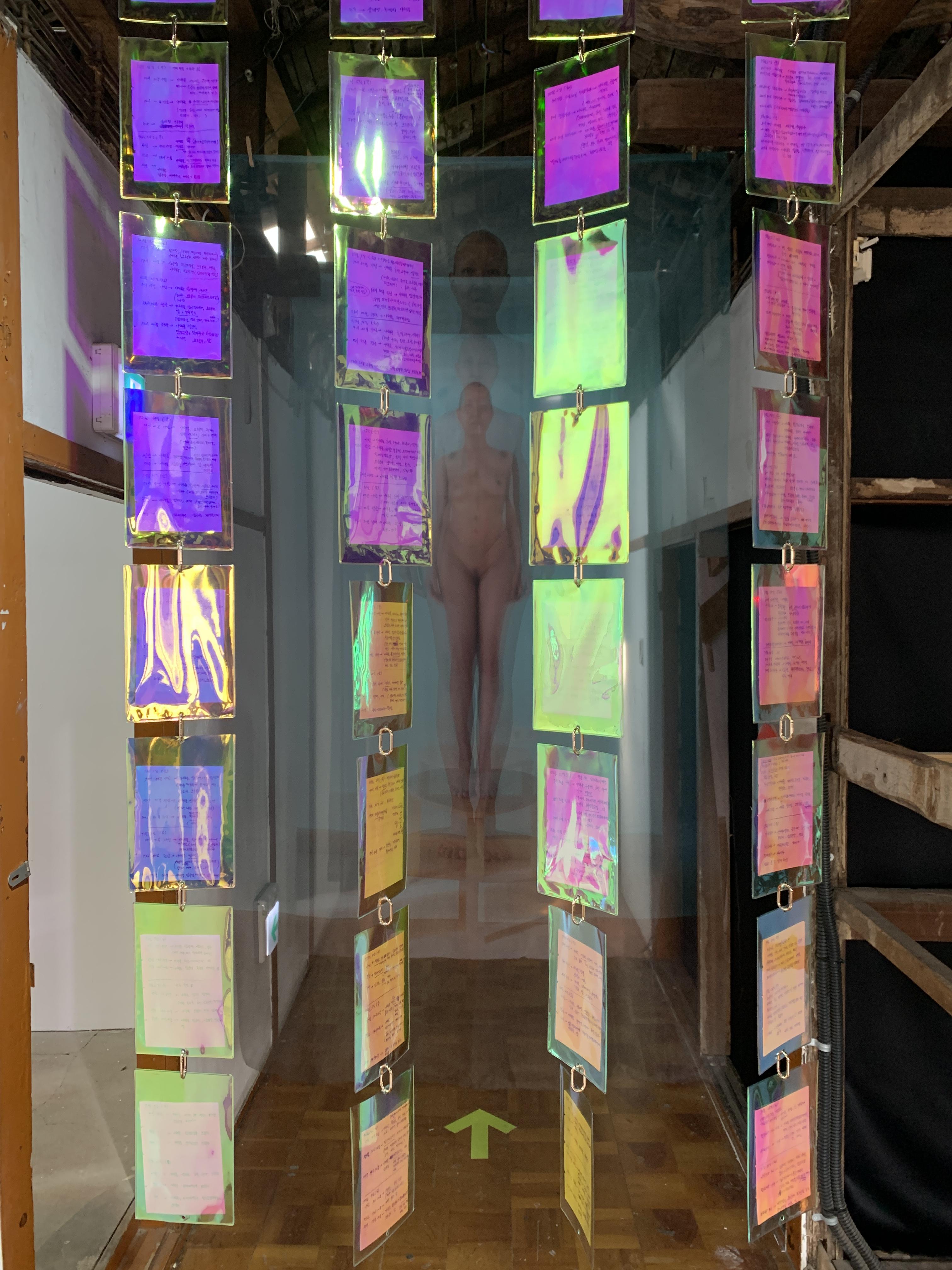 천장에 걸려있는 투병일지와 이 단의 몸이 커다랗게 프린트된 반투명한 얇은 천 여덟 장이 압도적인 시각 효과를 보여주며 넘실거린다. 천과 천 사이를 거닐며 눈에 보이는 것 너머로 진입하고, 흩어지고 중첩되고 완성되는 이미지의 보이지 않는 일부가 된다. 병들고 망가진 나와 건강한 나는 서로를 말없이 응시한다. 누구에게나 벌어질 수 있는 일이 내게도 벌어진 것뿐이라는, 단순하고 아픈 진실이 서리서리 풀려나온다.