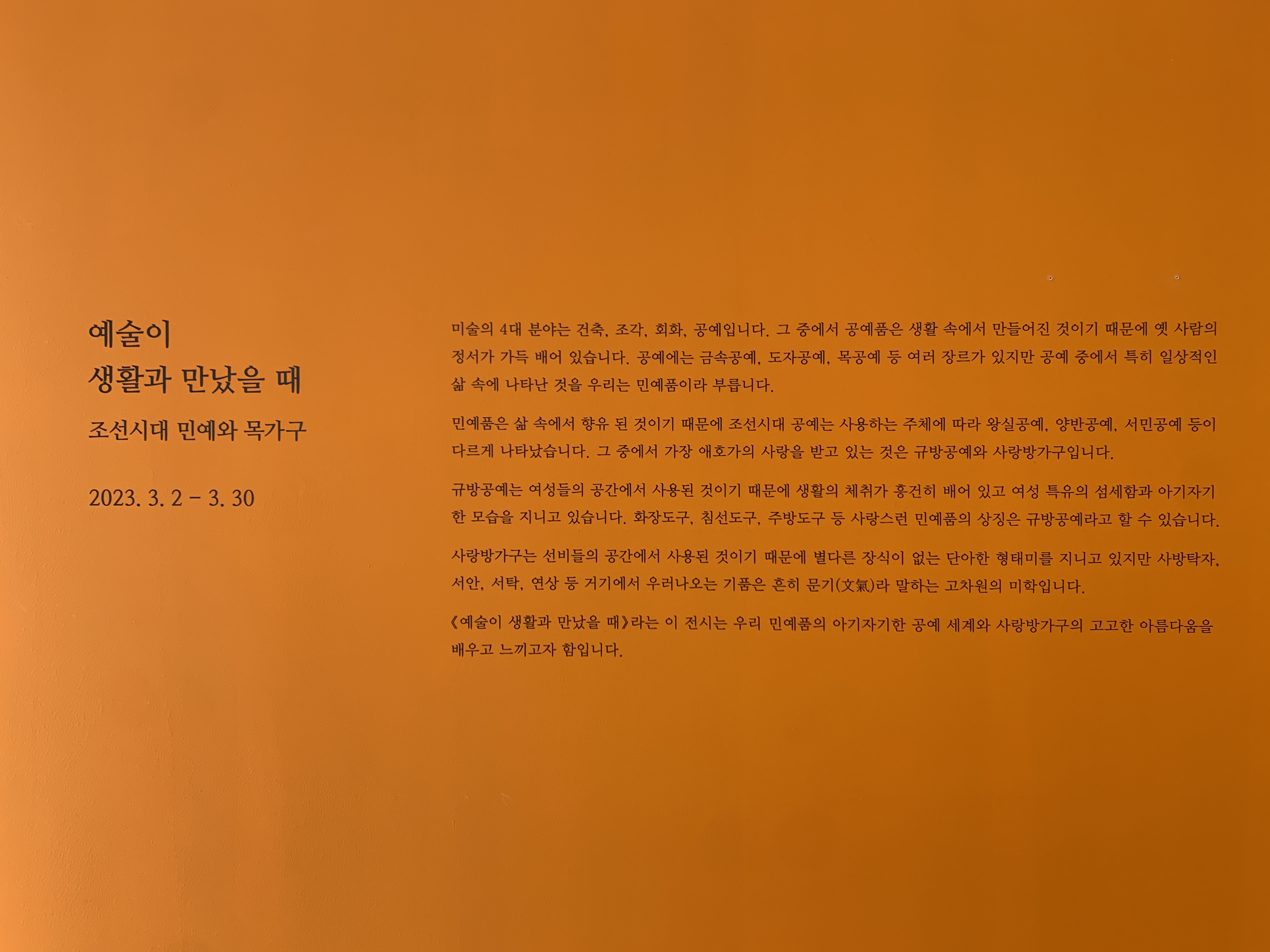 미술의 4대 분야는 조각, 건축, 회화, 공예라고 한다. 이 중에서도 공예품은 생활과 관련이 깊기 때문에 사람의 정서가 가득 베어 있다. 도자공예, 금속공예, 목공예 등 공예에도 여러 종류가 있는데, 가장 일상적인 삶 속에서 전해 내려오는 것을 민예품이라고 부른다.